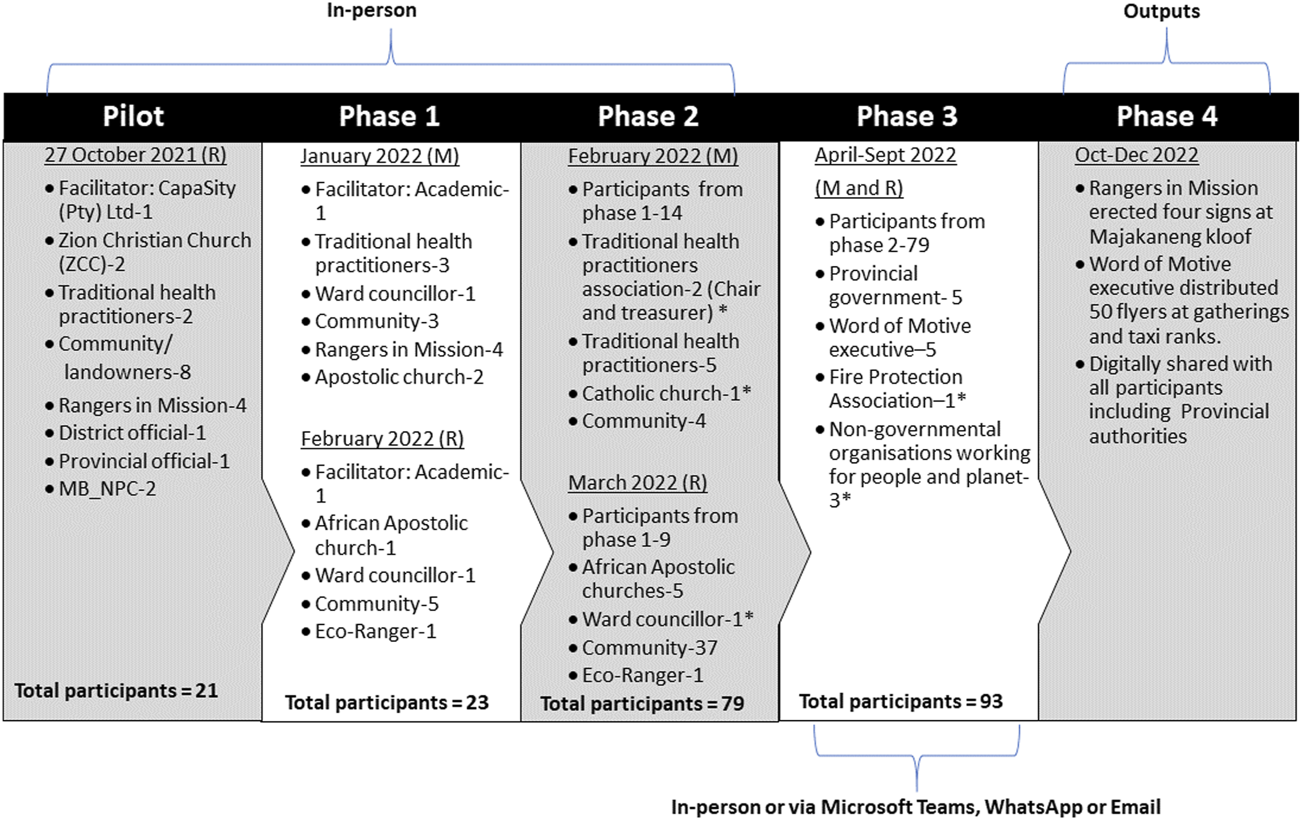 A timeline was developed to document key milestones and positive drivers of environmental change within the MBR, including community-led initiatives like the Majakaneng hiking trail. To show the origin of environmental change drivers, a key stakeholder matrix for the MBR which maps interests, influence, roles and engagement was created. The matrix provides a framework for future stakeholder involvement by enabling targeted engagement with high-influence groups, fostering inclusive participation among medium-influence groups and applying behavioural nudges to low-influence groups in order to mitigate negative impacts. Negative drivers were identified during a pilot meeting in Majakaneng on 27 October 2021, facilitated by CapaSity (Pty) Ltd, which highlighted socio-ecological pressures and informed the PAR intervention design. The meeting involved 21 participants from the Zion Christian Church (ZCC), traditional health practitioners, Majakaneng residents, Rangers in Mission, the BPDM Department of Health, North West Forestry and MB_NPC directors (Figure 1). Snowball sampling, based on the attendance register, identified individuals conducting spiritual rituals for focus groups and interviews. A ranger explained the methodology and obtained written consent. The rangers also assisted with translations during focus groups and interviews. Process diagram illustrating the participation and data generation phases of the PAR methodology. ‘M’ indicates that the focus group meeting took place in Majakaneng whereas a ‘R’ indicates Rustenburg. In addition, an asterisk (*) indicates that the participants were not part of a focus group meeting but were interviewed separately