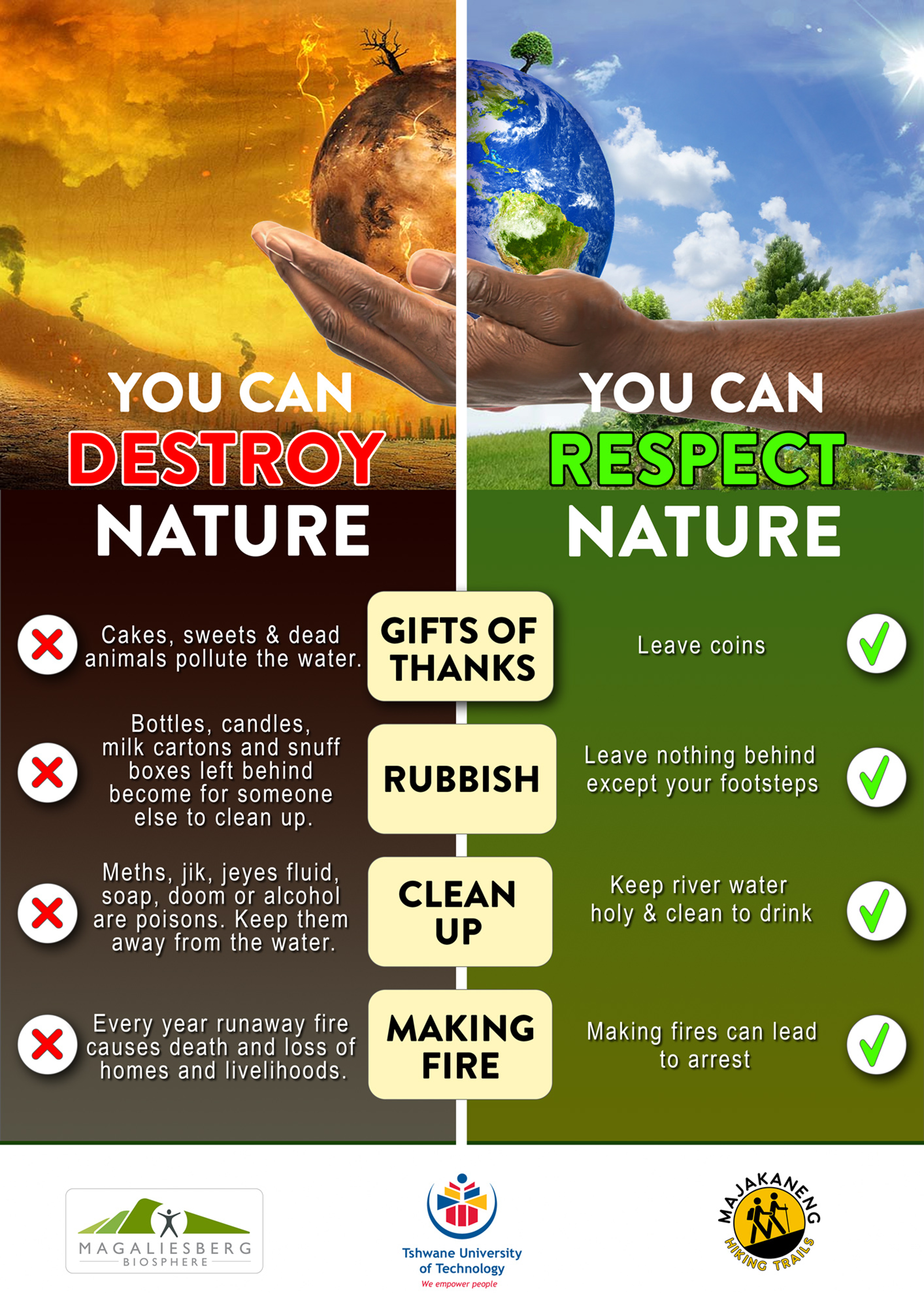 Belinda Cooper, and Andrew Murray of the Magaliesberg Biosphere Reserve NPC are acknowledged for building community trust over several years. Special thanks are extended to Gerry Comninos for designing the signage pro deo. Elna van Niekerk of CapaSity (Pty) Ltd is acknowledged for facilitating the pilot meeting in Majakaneng. I respectfully recognise the traditional knowledge and environmental stewardship of spiritual leaders in the North West Province, with particular appreciation to Buti Elias Mokwena for his lifelong commitment and volunteer service in preserving sacred natural spaces.
