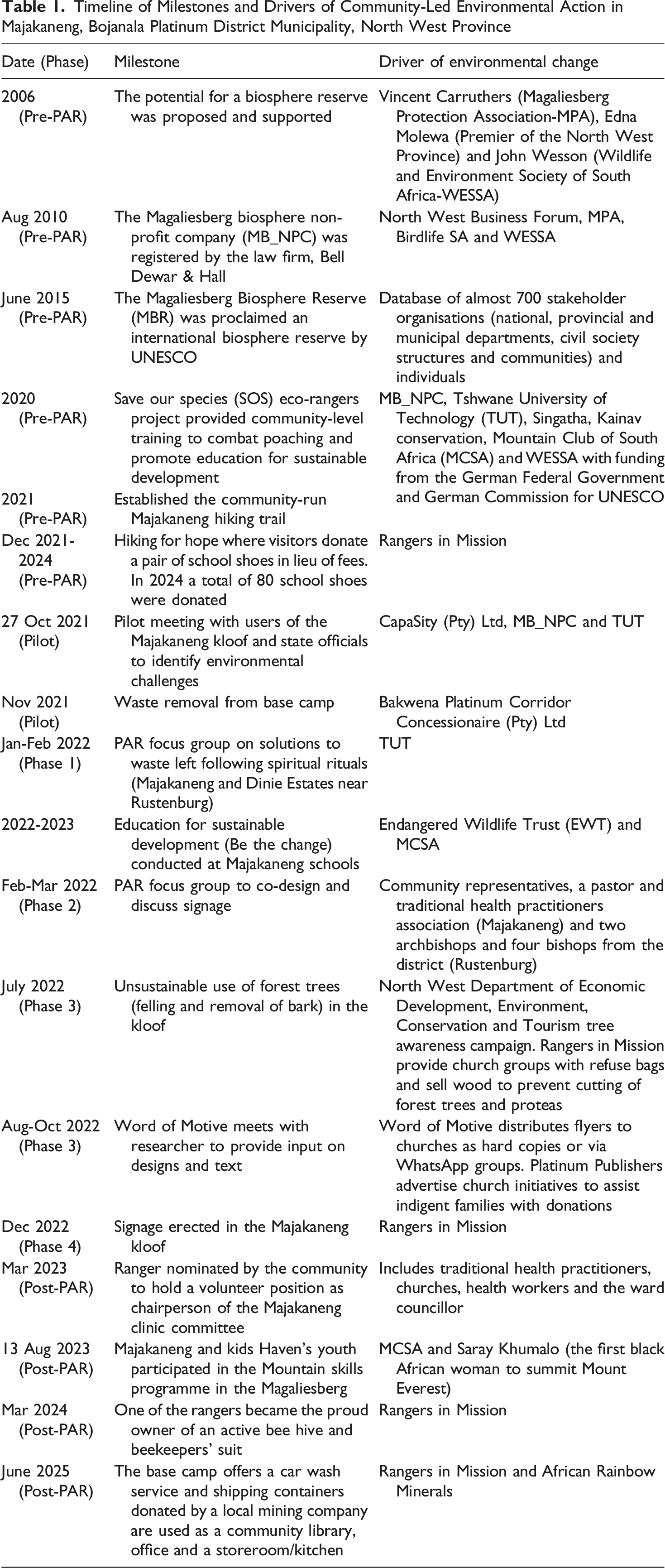 Timeline of Milestones and Drivers of Community-Led Environmental Action in Majakaneng, Bojanala Platinum District Municipality, North West Province