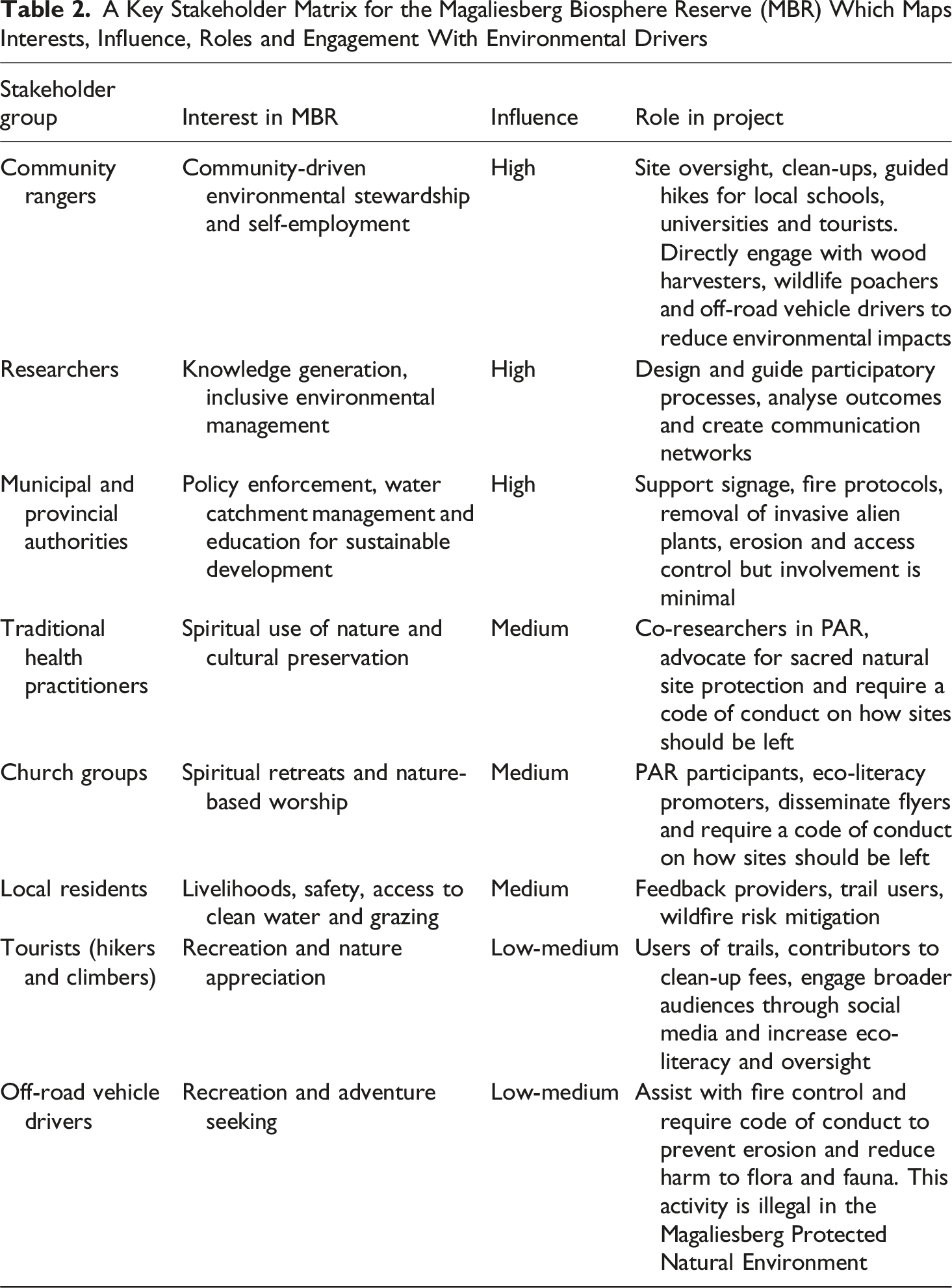 A Key Stakeholder Matrix for the Magaliesberg Biosphere Reserve (MBR) Which Maps Interests, Influence, Roles and Engagement With Environmental Drivers