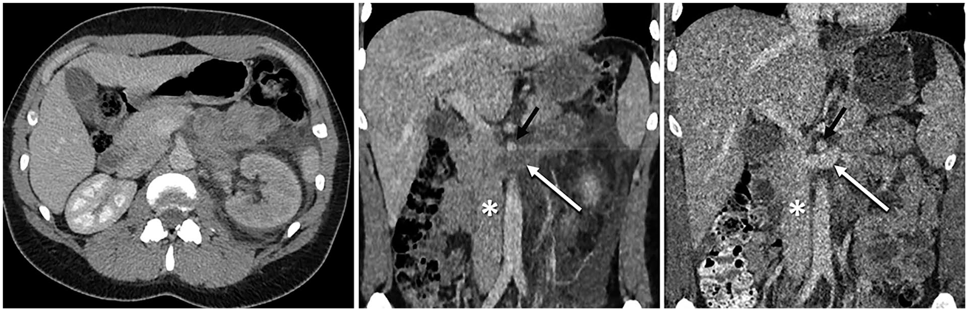 Venous phase computed tomography (CT) angiographies. Pre-operatively (left and center), the left kidney was poorly opacified and oedematous with perirenal fat stranding and total obstruction of the renal vein (white arrow). Post-operatively (right), the left renal vein is fully opacified. The inferior vena cava (*) and super mesenteric artery (black arrow) are marked.