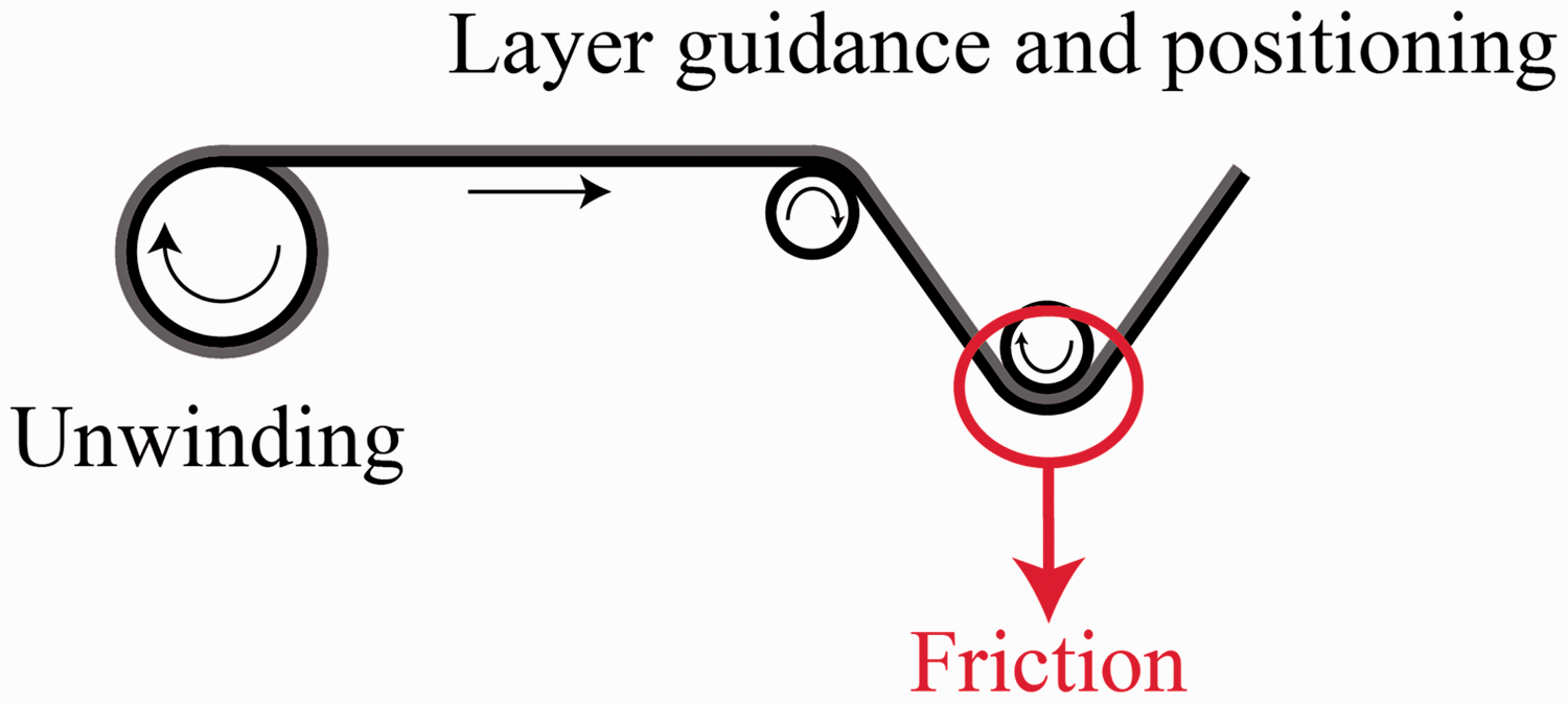 Schematisation of the friction stress applied to the fabric after the growth of the CNTs during the unwinding and the layer guidance and positioning of the fabric.