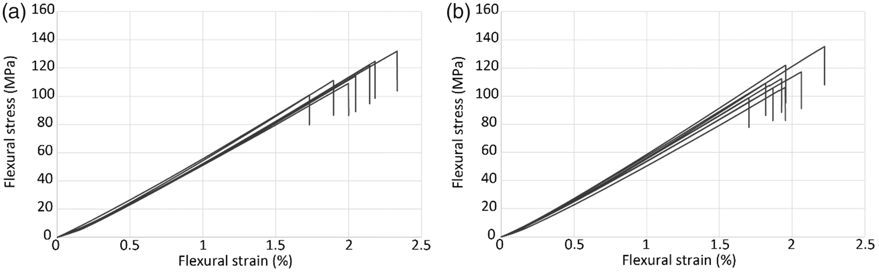 Figure 10(a) presents the curve for the surface before wear, and it can be observed that there is a small dispersion of the slopes of the curve, which represents the flexural modulus, but the dispersion is greater at the breaking point. With regard to the results after the wear of the surface illustrated in Figure 10(b), there is greater dispersion of the slope of the curve, that is, the flexural modulus, and the breaking point is highlighted.