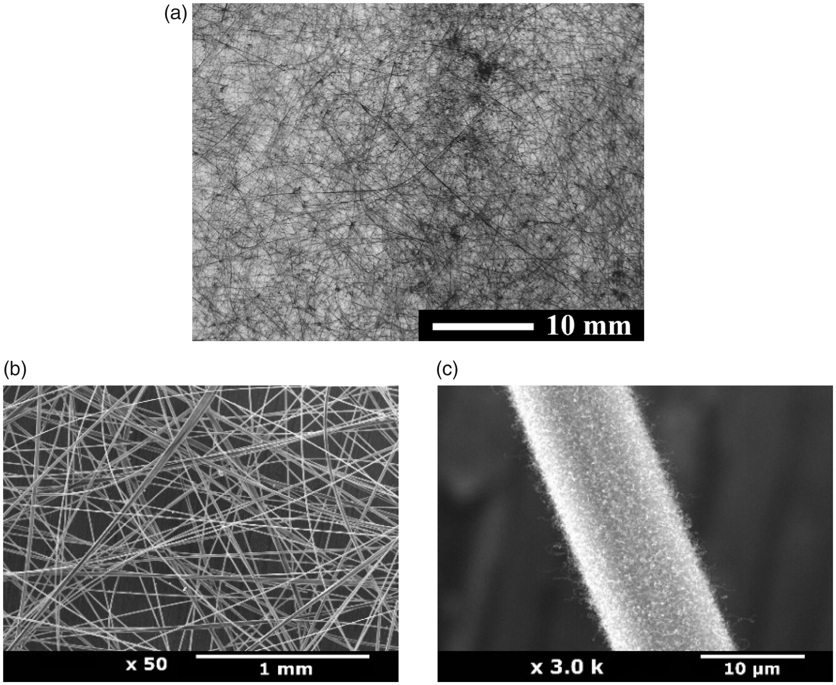 SEM pictures of the CNTs grown carbon fibre reinforcement: (a) general view, (b) with a magnification of × 50 and (c) with a magnification of × 3000.