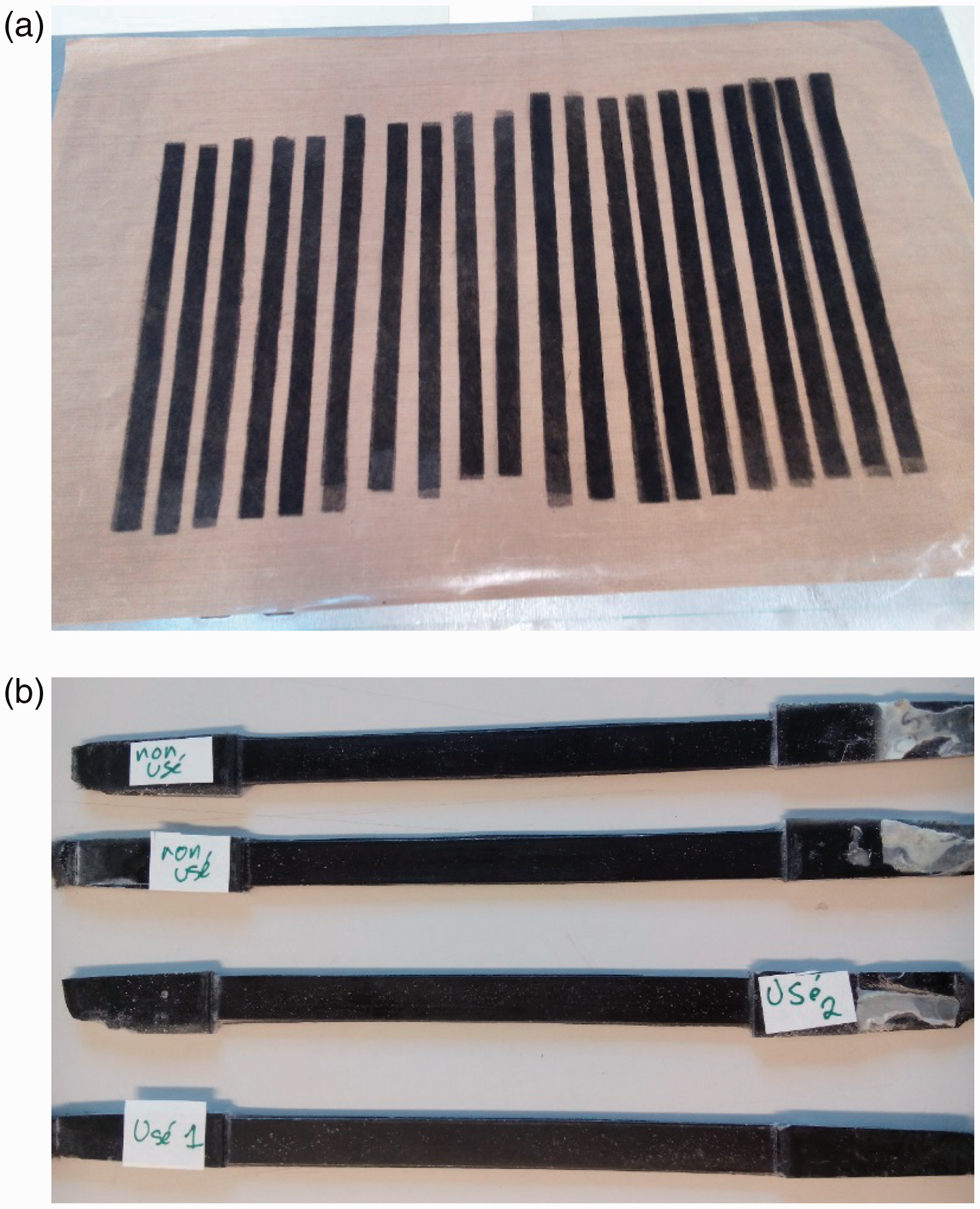 The wear of the CNTs was realized by compression with a press composite machine using a planar mould in order to ensure that the distribution of pressure on the fabric was homogeneous and polytetrafluoroethylene sheets to avoid sticking between the plies and the mould. The pressure is applied at one time on a pair of plies to create binding points between them (Figure 3(a)). The exerted pressure was chosen to induce wear of the CNTs and, in the same way, to limit the breaking damage of the fibres. Then, the value determined was around 10 MPa.