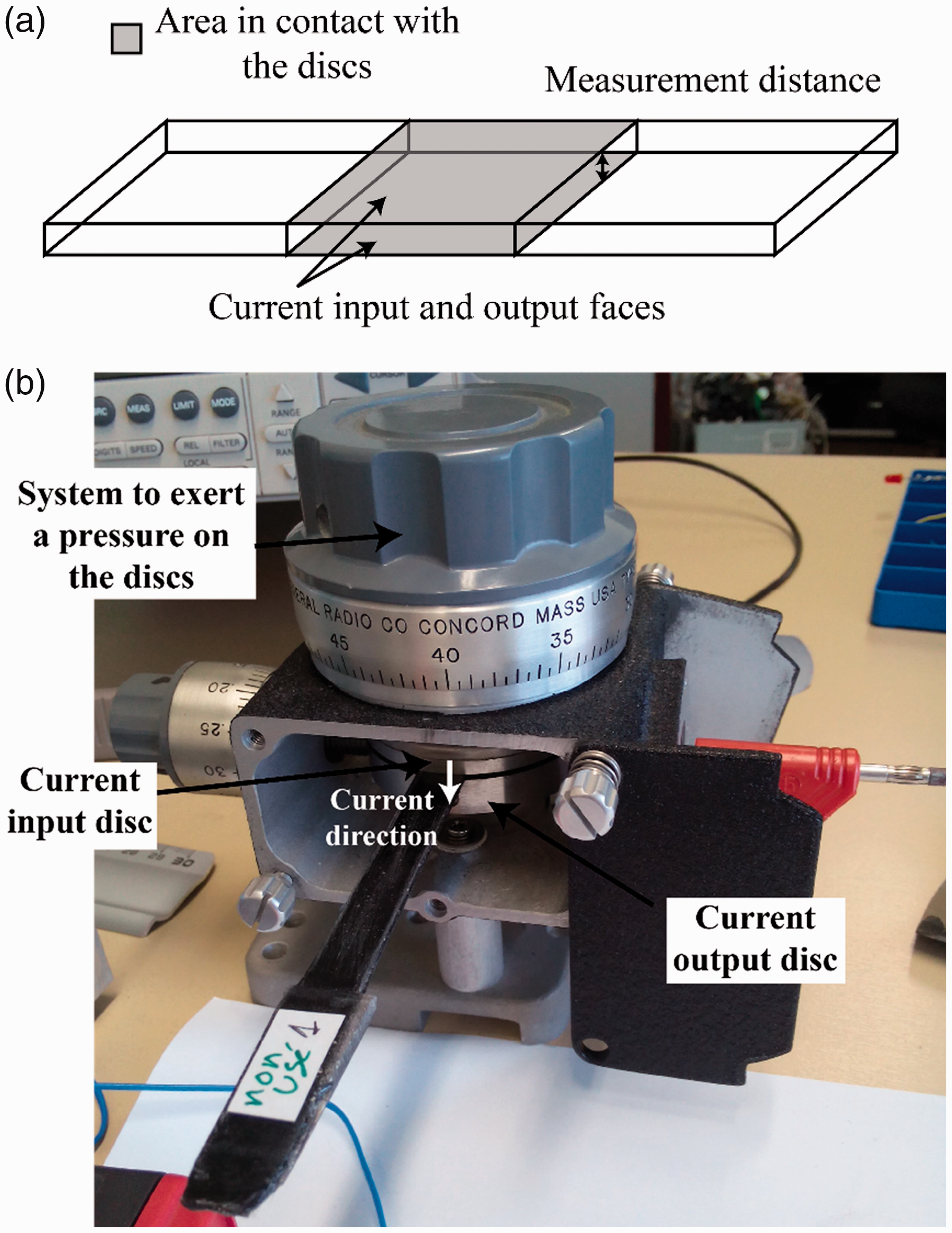 Illustration of the technique used to determine the transversal electrical resistivity: (a) principle drawing and (b) picture of the system. The current is applied from the input to the output discs. Illustration of the technique used to determine the longitudinal electrical resistivity: (a) principle drawing and (b) picture of the system. The current goes leftward. Graph illustrating the electrical resistance as a function of the applied current, in that case a transversal measurement with an unworn fabric.