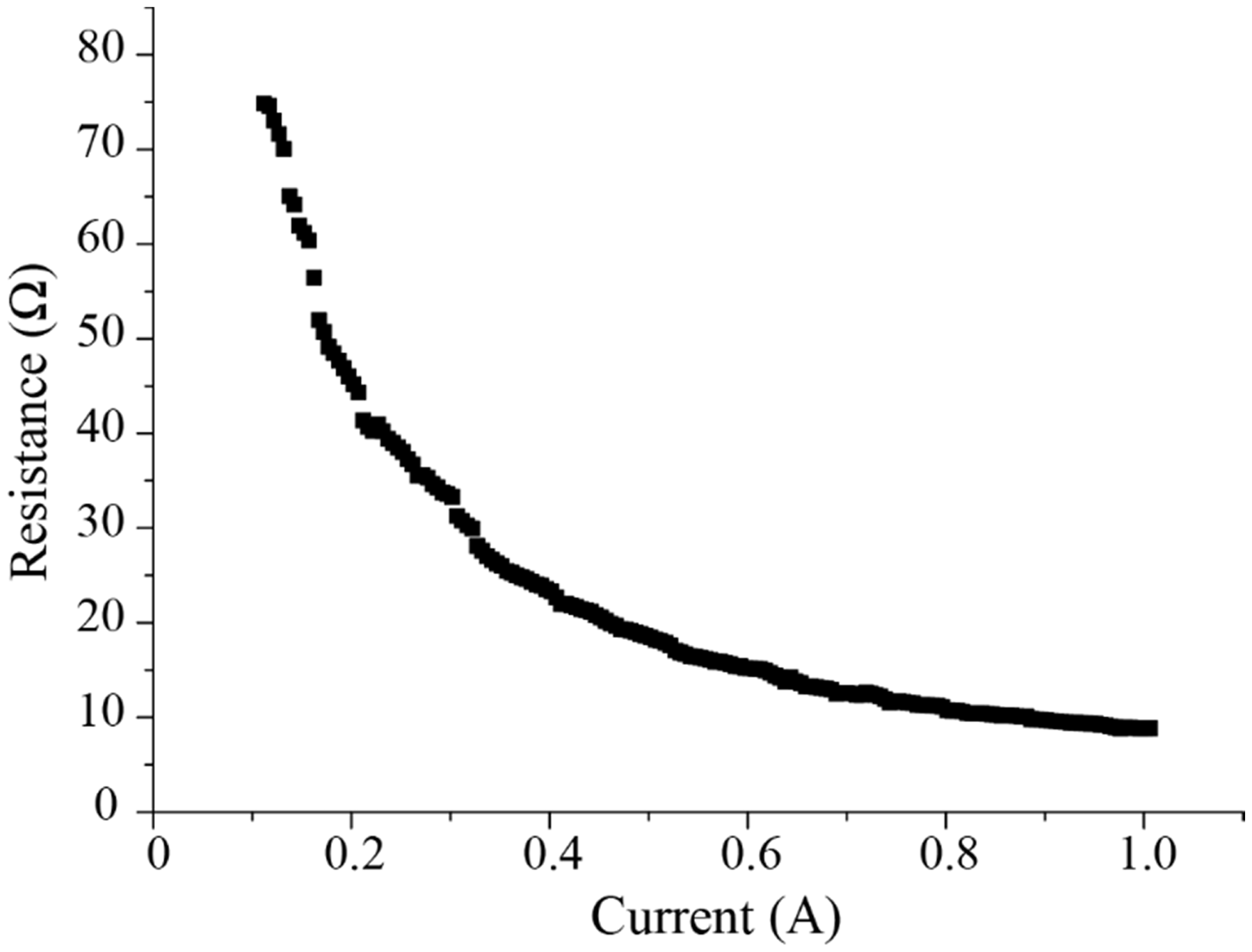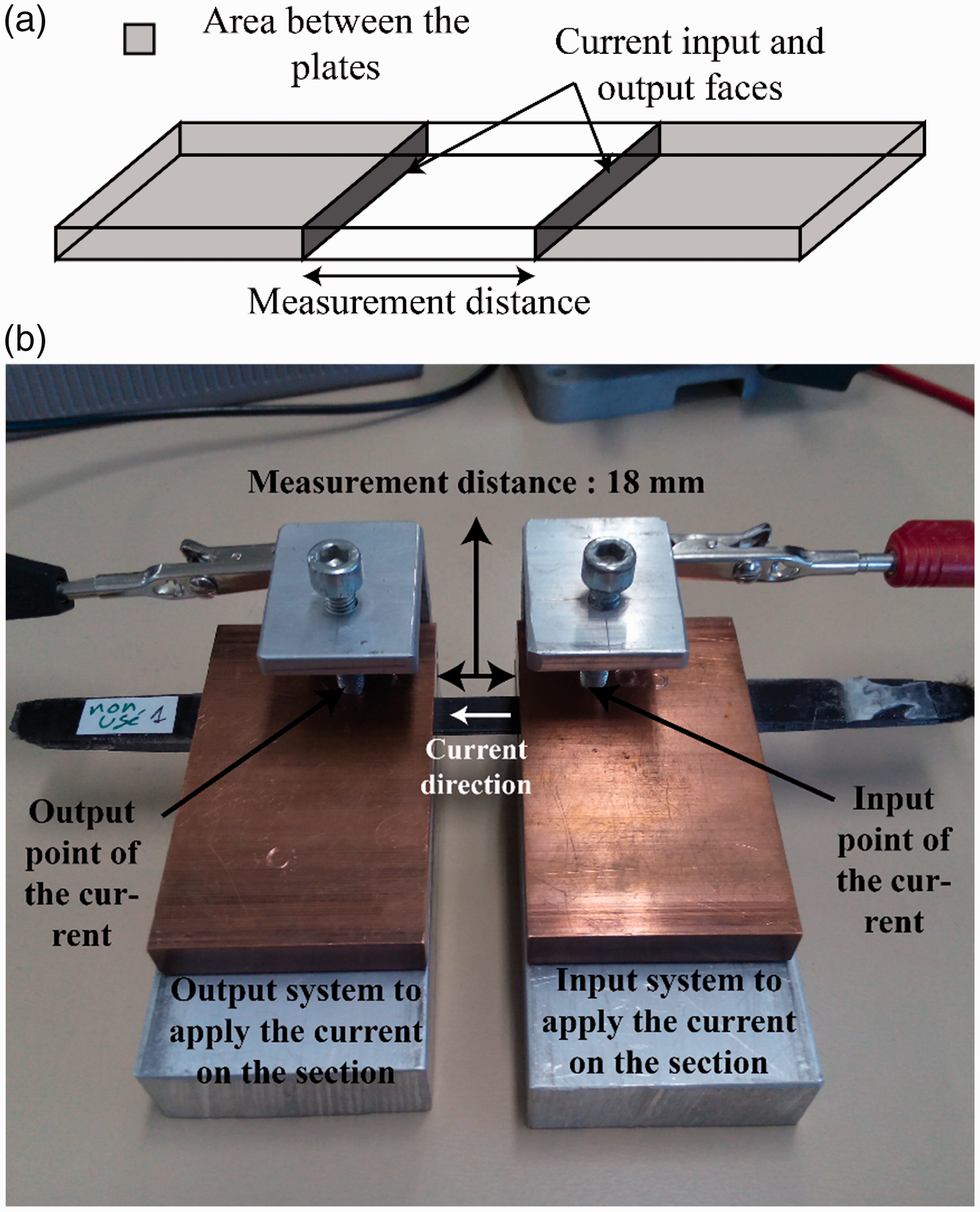 The measurements were done transversally (Figure 4) and longitudinally (Figure 5) and consisted of applying a electrical current supply to the materials (from 100 mA to 1 A) and measuring the tension between the two sides of the sample. These tests are realized in two different configurations relative to the kind of measurement: longitudinal (Figure 4) or transversal (Figure 5). The obtained curve is presented in Figure 6, which represents the evolution of the electrical resistance as a function of the applied current. To measure the electrical resistivity of the composite materials, the steady state is considered. It corresponds to the lowest resistance value (at higher current). For example, in Figure 6, the measured resistance is 8.8 Ω, leading to a resistivity of 3.87 Ω m. This value is then multiplied by the surface/distance ratio of the two sides of the sample (current input and output faces). This allows the electrical resistivity of the composite materials relative to the distance between the electrodes to be determined (in Ω·m).