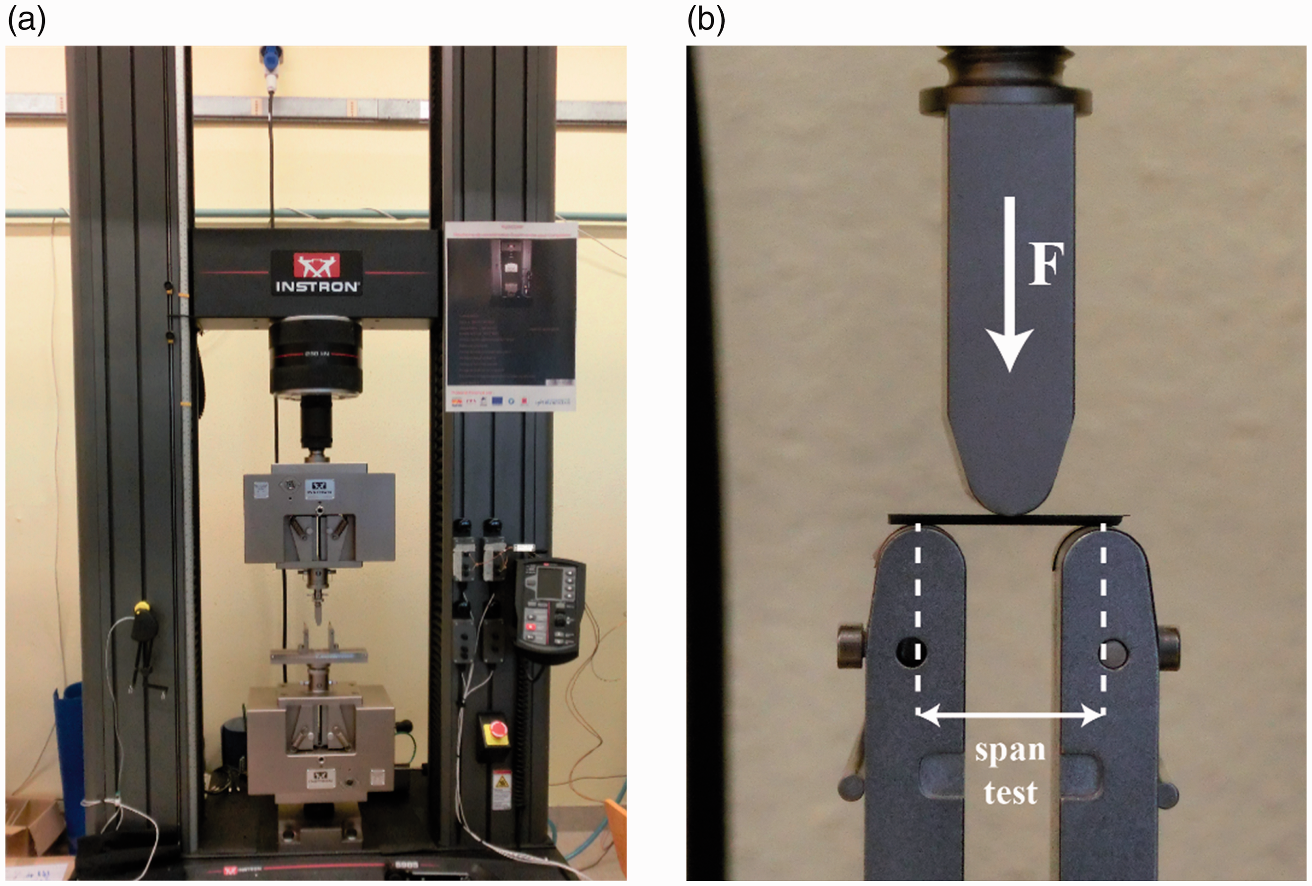 The mechanical properties were measured by three-point flexural test in accordance with the NF EN ISO 14125 standard. Figure 7 presents the tensile machine (Figure 7(a)), and the three-point flexural system (Figure 7(b)) used to determine the mechanical properties. The length between the fixed supports is 20 mm (according to the standard, where distance/thickness = 16), and the force is applied in the middle of the sample until the breakage of the sample occurs. The tests were realized in an Instron 5985 tensile machine with a load cell of 2 kN (2580 Serie) with an accuracy with a maximum error of 0.15% of the load considered. The tests are displacement controlled and realized with a loading rate of 0.5 mm/min. During the test, the load and the displacement of the support are recorded, and then the flexural modulus, strain at failure and stress at failure can be calculated. Furthermore, the fracture surfaces were observed by scanning electron microscope (SEM).