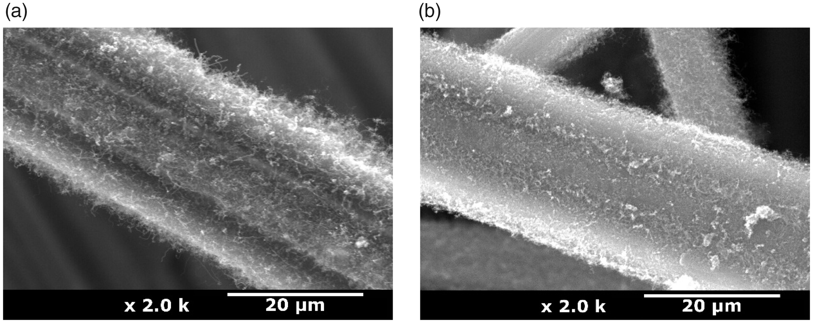 Figure 2 shows the aspects of the nonwoven reinforcement after the growth of the CNTs on the surface. It can be observed that the density of the reinforcement is small, but that the CNTs are grown homogeneously on the fabric and around the fibres. The length of the CNTs is approximately 2 µm, and they have a diameter of around 10 nm.