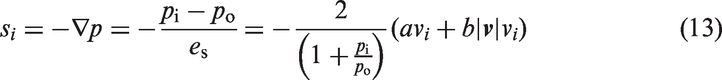 Modified momentum equations including source term were deduced to simulate the effect of material permeability. Because the fabric of the canopy is very thin, the heat and abrasion caused by friction due to permeability have little effect on the aerodynamic performance. Thus, they were ignored in this paper. The whole flow field was divided into porous medium (canopy) zone and free (flow field) zone. In prior research, the incompressible Ergun equation was introduced into the source terms of momentum equations in the porous medium zone [14]. It can only apply to subsonic parachute. The source term is