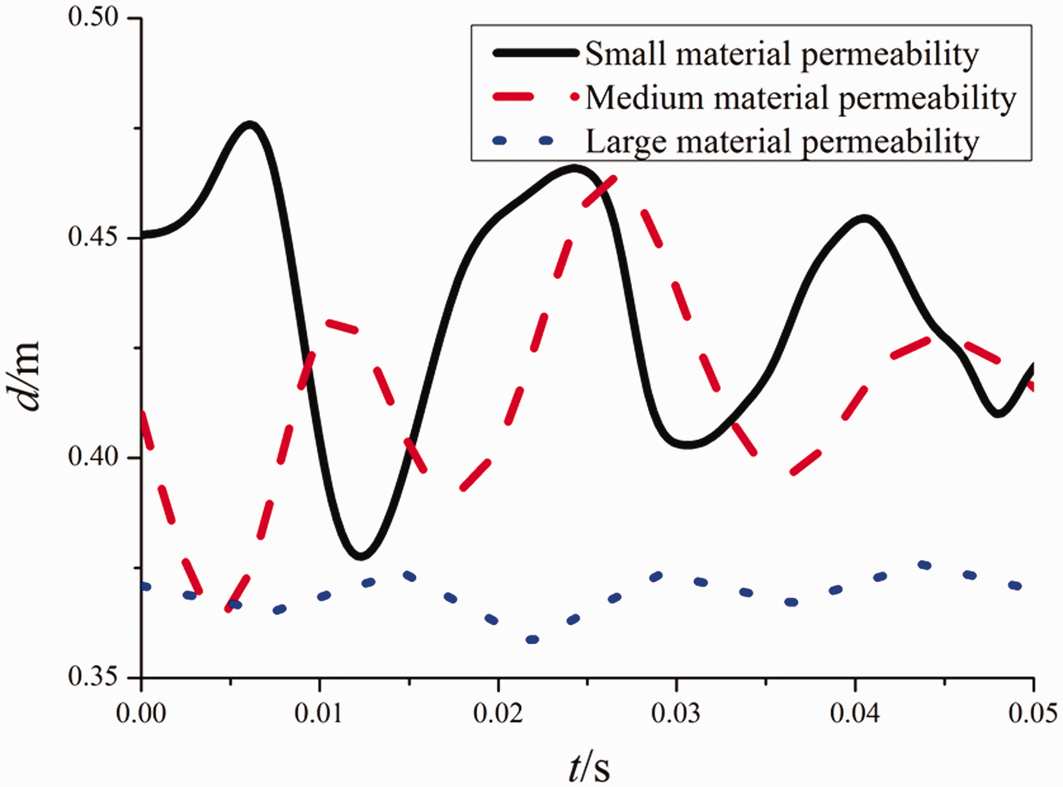 Material permeability values have big influence on drag coefficients and shock wave standoff distances, as shown in Figures 9 and 10. With the increase of the material permeability, the average values of drag coefficients and shock wave standoff distances decrease. So are the corresponding oscillation amplitude and frequency. And the oscillation changes from irregular state to regular state. When Drag coefficient. Shock wave standoff distance.