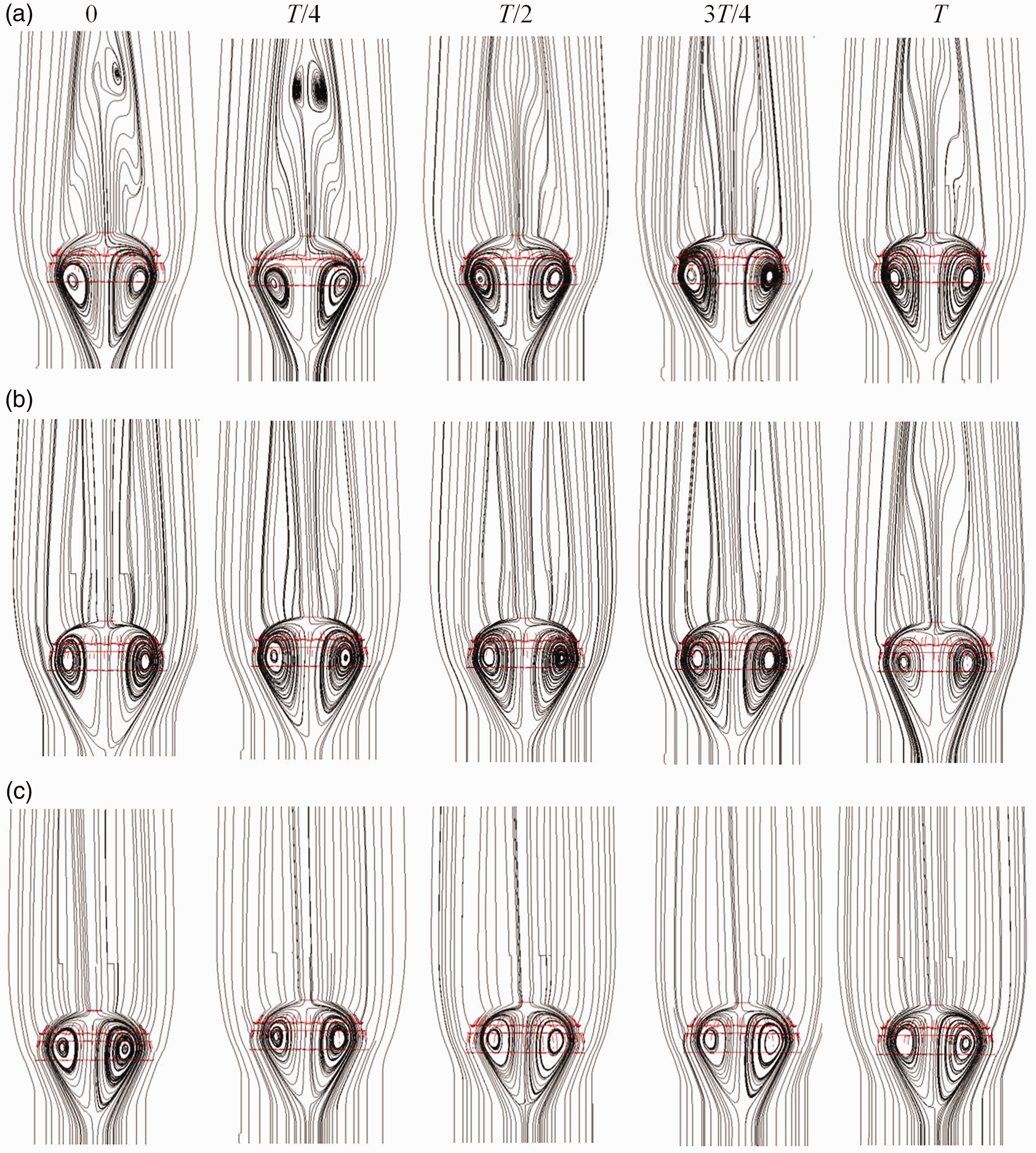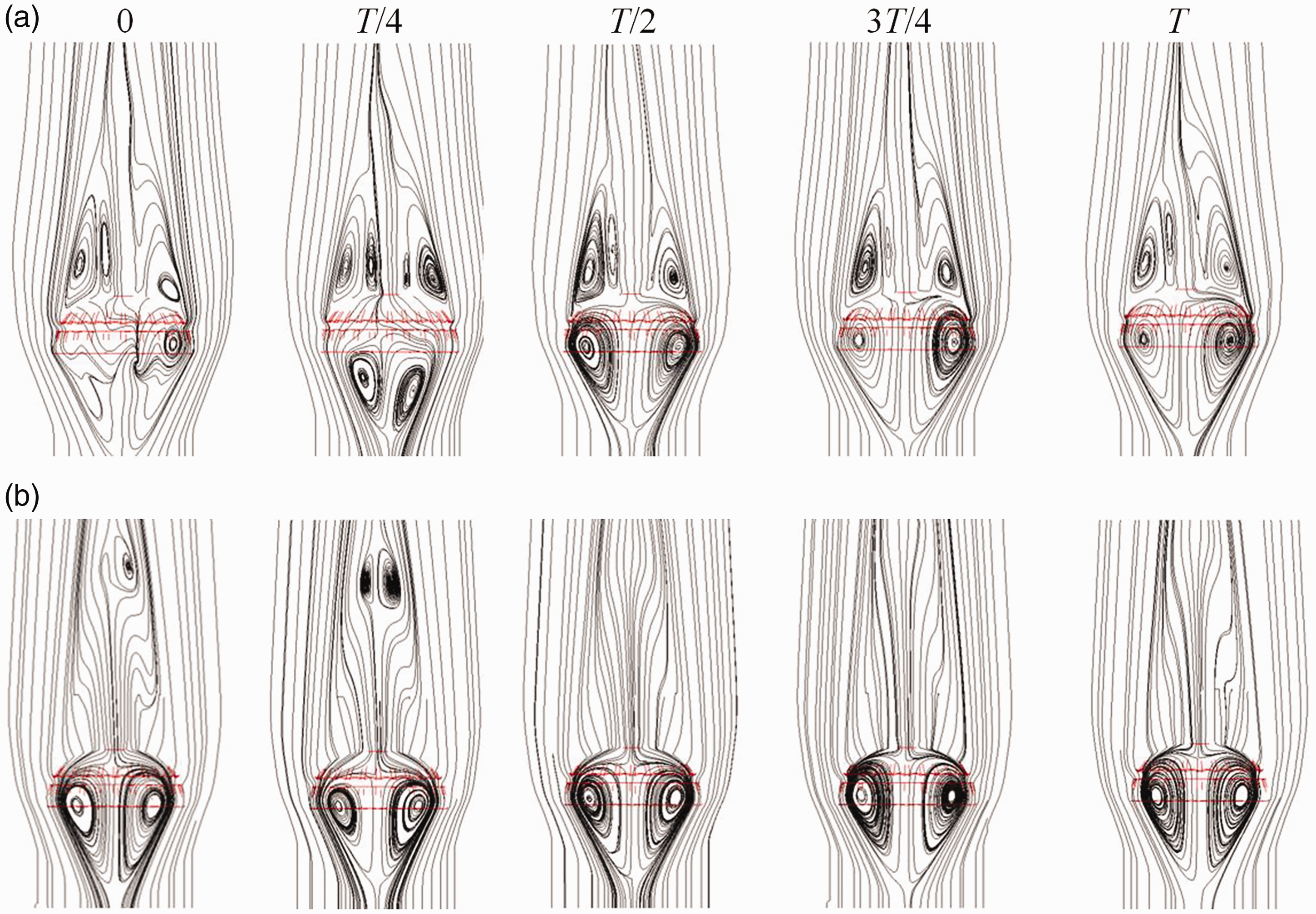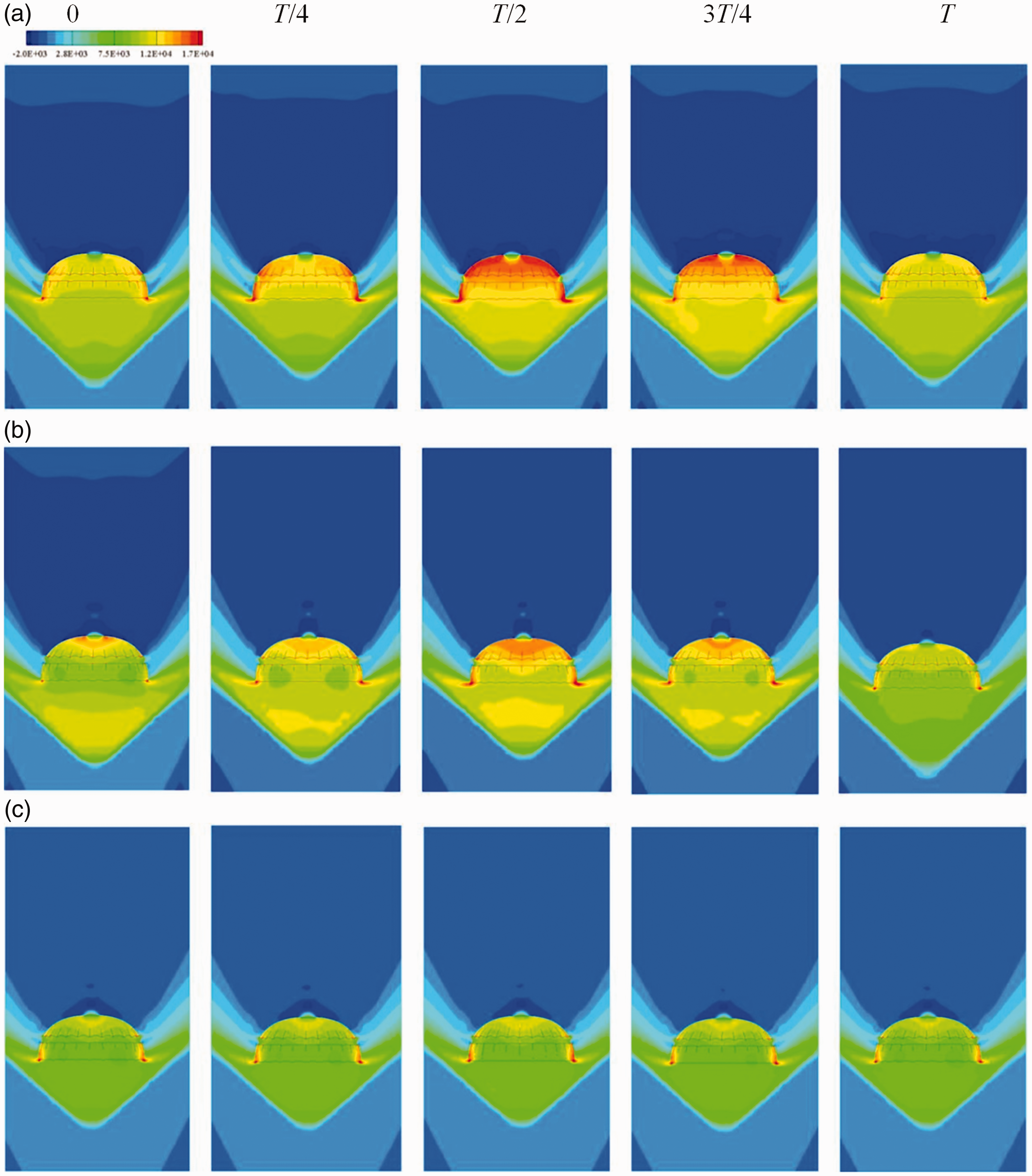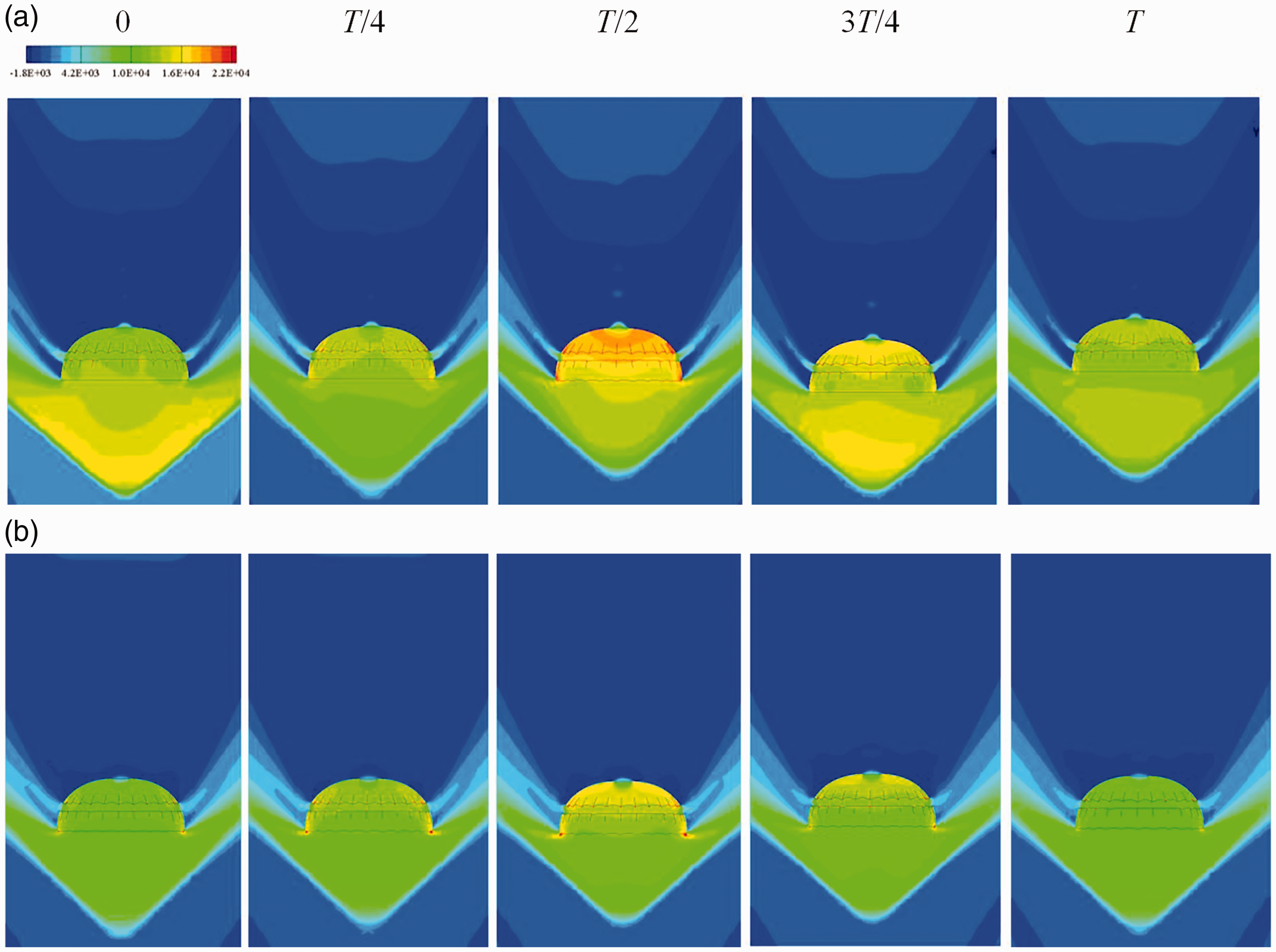 Figures 11 and 12 show the velocity streamlines and pressure contours around the canopy at five typical moments in the oscillation cycle of Cases 1, 3 and 4. The discontinuity of velocity streamlines is due to the graphic treatment of the interface between the tetrahedral and hexahedral elements. They are continuous actually. Since velocity streamlines are perpendicular to the disk and parallel to the band, flow expels mainly at the disk. Therefore, with the increase of material permeability, inner pressure around the disk decreases more significantly than that around the band. The decrease of the inner pressure causes the shock wave to have a smaller standoff distance and a bigger shock wave angle. The velocity streamlines become straighter and the flow structure becomes more stable.