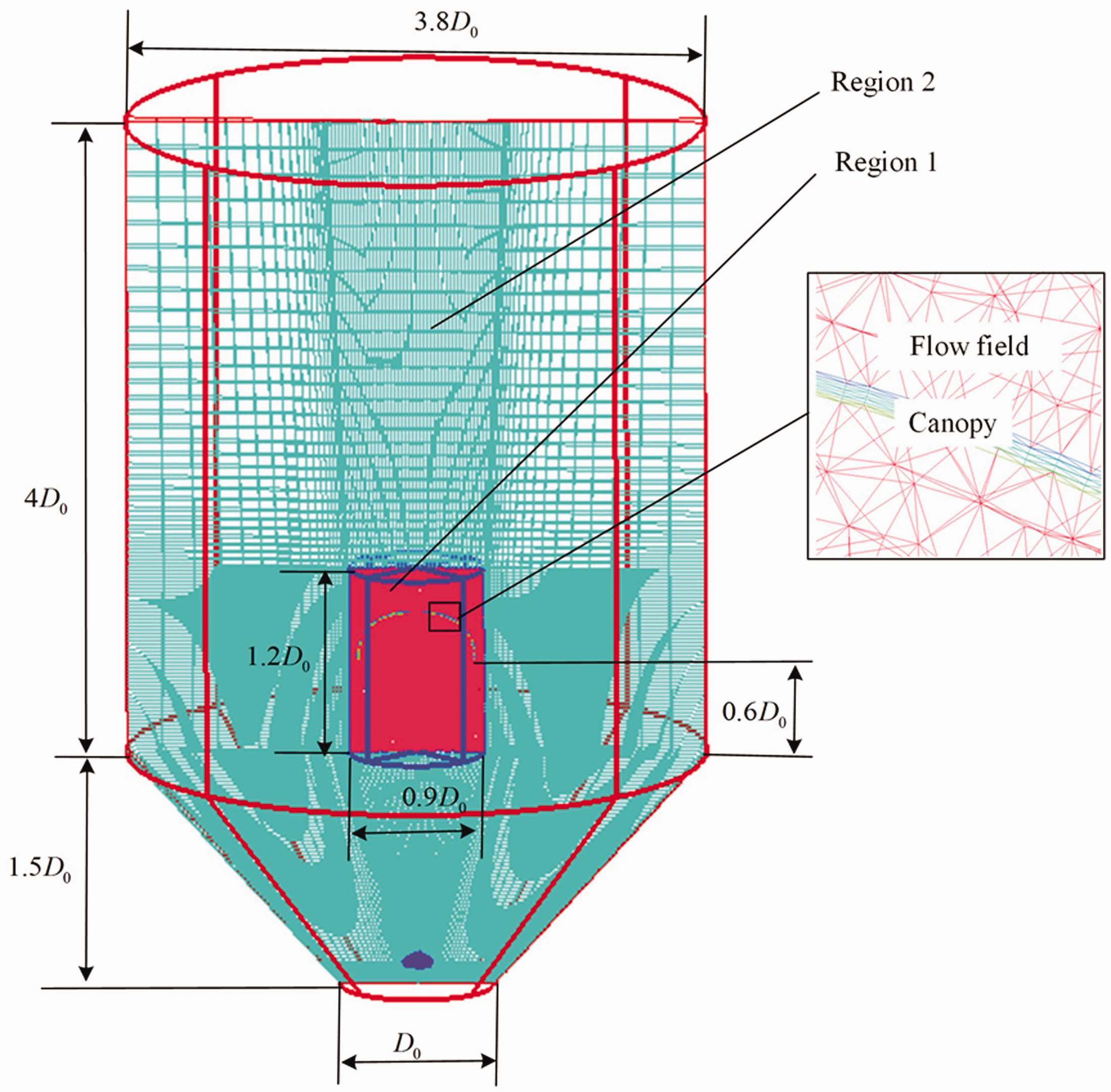 The initial shape of the canopy in numerical simulation was conducted based on the photo captured by the wind tunnel test. Figure 2 shows the flow field mesh. By using 30,930 regularly arranged tri-prism elements in the canopy zone, velocity through the canopy could be simulated more accurately. The flow field zone was discretized using 555,457 tetrahedral elements in region 1 and 361,088 hexahedral elements in region 2. And there were 10,120 pyramid elements between the two regions. For the porous canopy, the permeability source term was imposed to the porous medium zone. Non-slip, adiabatic boundary conditions were imposed on the non-porous canopy and capsule. The pressure-far-field condition was imposed on the flow field boundary. The coefficient of viscosity was treated in accordance with Sutherland's law. The Flow field mesh (here,