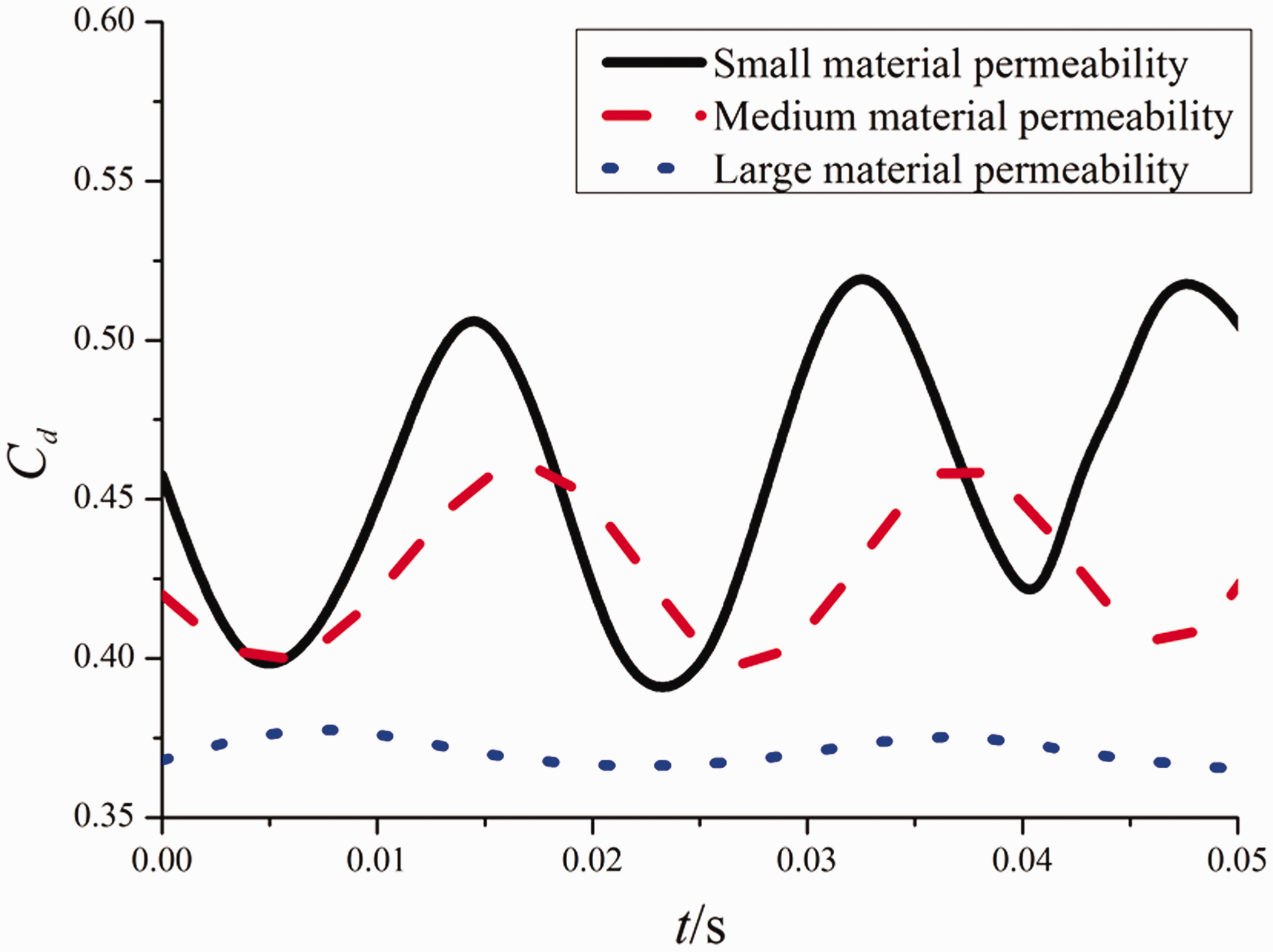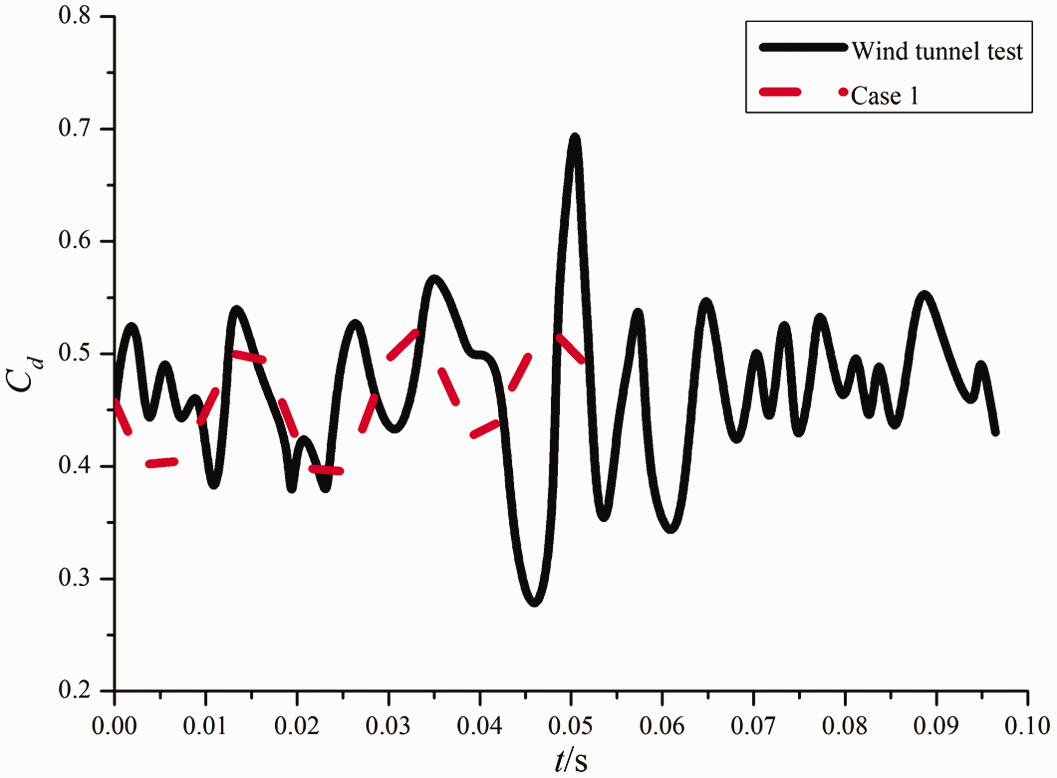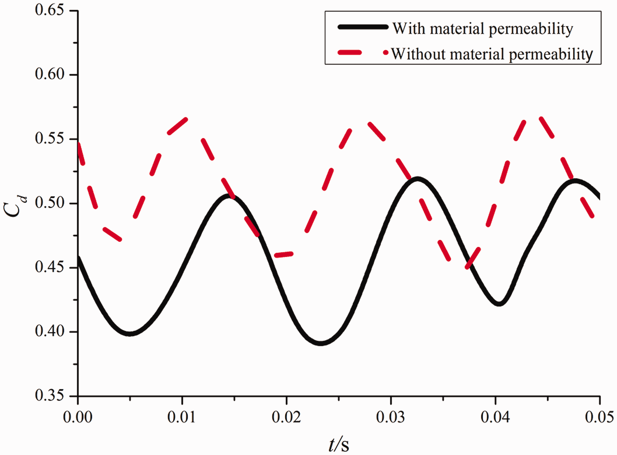 Case 1 and the wind tunnel test have the same ambient conditions and permeability parameters. Figure 3 compares the shock wave in front of the canopy in the wind tunnel test [16] and numerical simulation. Its standoff distance and shape are in accordance with the wind tunnel result. The shock wave of Case 1 is more symmetrical because the action of turbulence pulsation to the flow field is neglected. Figure 4 shows the comparison of drag coefficients in the wind tunnel test and Case 1. The average value of the drag coefficient in the numerical simulation and wind tunnel test is 0.454 and 0.461, respectively. The error of the average value of the drag coefficient is 1.5%. It can be seen that this numerical method has high accuracy.