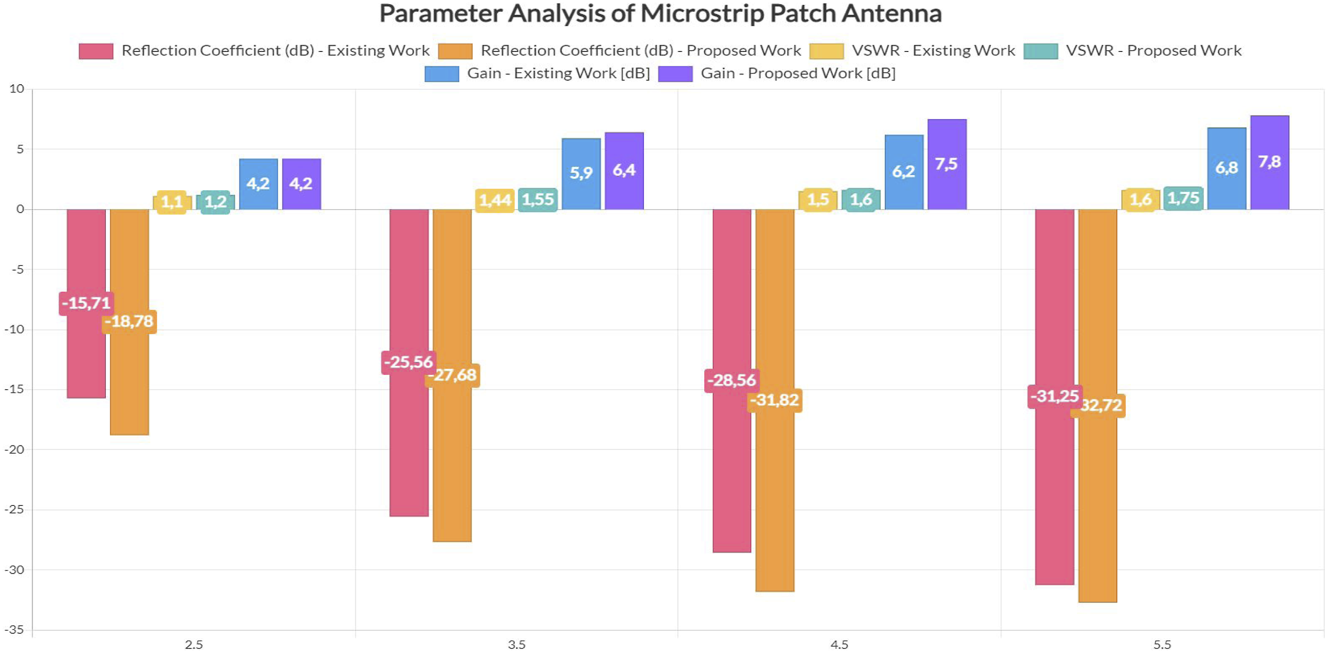 The Comparative analysis of the MSPA is shown in Table 2. Gain, VSWR, return loss, radiation efficiency, radiation pattern, reflection coefficient, and other parameters are used to evaluate the antenna’s performance is shown in Figure 10. These characteristics are used to objectively evaluate antennas and determine their suitability for a given application. The scattering(s) parameters are used to analyze the return loss. The loss of signal power produced by reflection induced by incorrect antenna-to-feed-line matching is known as return loss. A high VSWR means that the rate of return loss is larger. It’s also a measurement of the load’s mismatch with the transmission line. The VSWR (Voltage Standing Wave Ratio) is often used to calculate the Standing Wave Ratio. The standing wave ratio is calculated as follows: The VSWR is calculated using the formula VSWR = Vmax/Vmin. Parameter analysis of microstrip patch antenna.