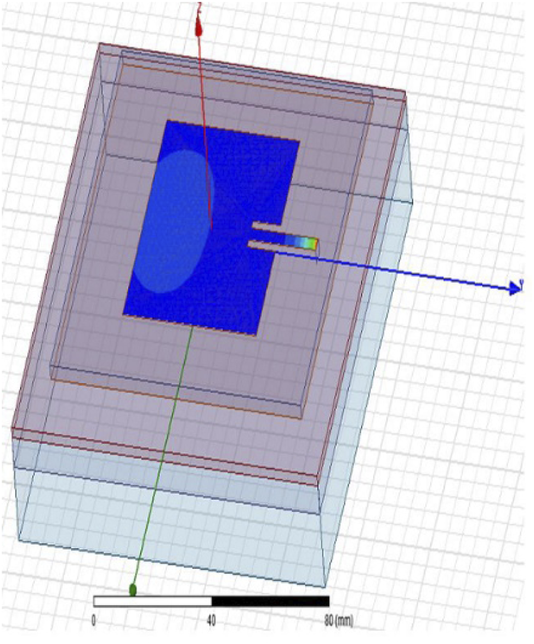 The results from the measured and on-body simulation, on the other hand, reveal the same bandwidth with a minor difference in the amount of reflection coefficient. The discovered result showed the disparity between simulation and measurements. Because the prototype is flexible, manufacturing mistakes, SMA connector losses, cable losses, and connection repeatability with the feeding cable might all be to blame for the discrepancy in the reflection coefficient in the free space environment. The loss in the on-body simulation might also be caused by an on-body structure. Figure 2 depicts the simulated design of the proposed MSPA. Because the obtained reflection coefficient is −32.78 dB, the antenna will perform better. The ratio of the power an antenna generates to the power it receives is known as its efficiency. It’s also known as the gain of the antenna divided by the directivity of the antenna. Proposed structure of MSPA using HFSS.