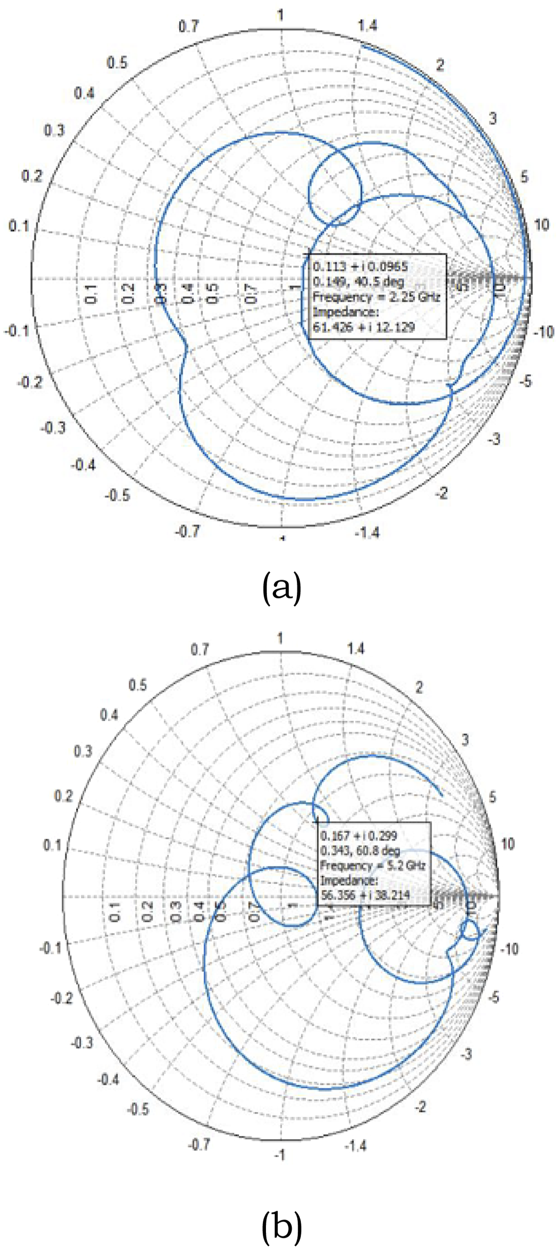 Over the whole working spectrum, the gain of the proposed antenna as determined by simulations conducted in a chamber and on a body is in excellent agreement with simulations conducted in free space. For all theta values, phi must equal 0° in order to produce the E plane radiation pattern. Similarly, for all values of theta, phi has been fixed to 90° in order to achieve the radiation pattern of the H plane. The H-plane pattern demonstrates a bidirectional radiation pattern at all of the chosen frequencies. The radiation is unidirectional in the E-plane. It is seen that the vacant area in both planes is properly matched. Simulations of the body and measurements of patterns at specified frequency. Over the whole working spectrum, the gains of the proposed antenna as determined by simulations conducted in a chamber and on a body are in excellent agreement with simulations conducted in free space is shown in Figure 7. The smith chart of the proposed antenna is shown in Figure 8. On body and off body of wearable devices. Smith chart of the proposed antenna. (a) E-Field of the Proposed Antenna, (b) H-Field of the Proposed Antenna.