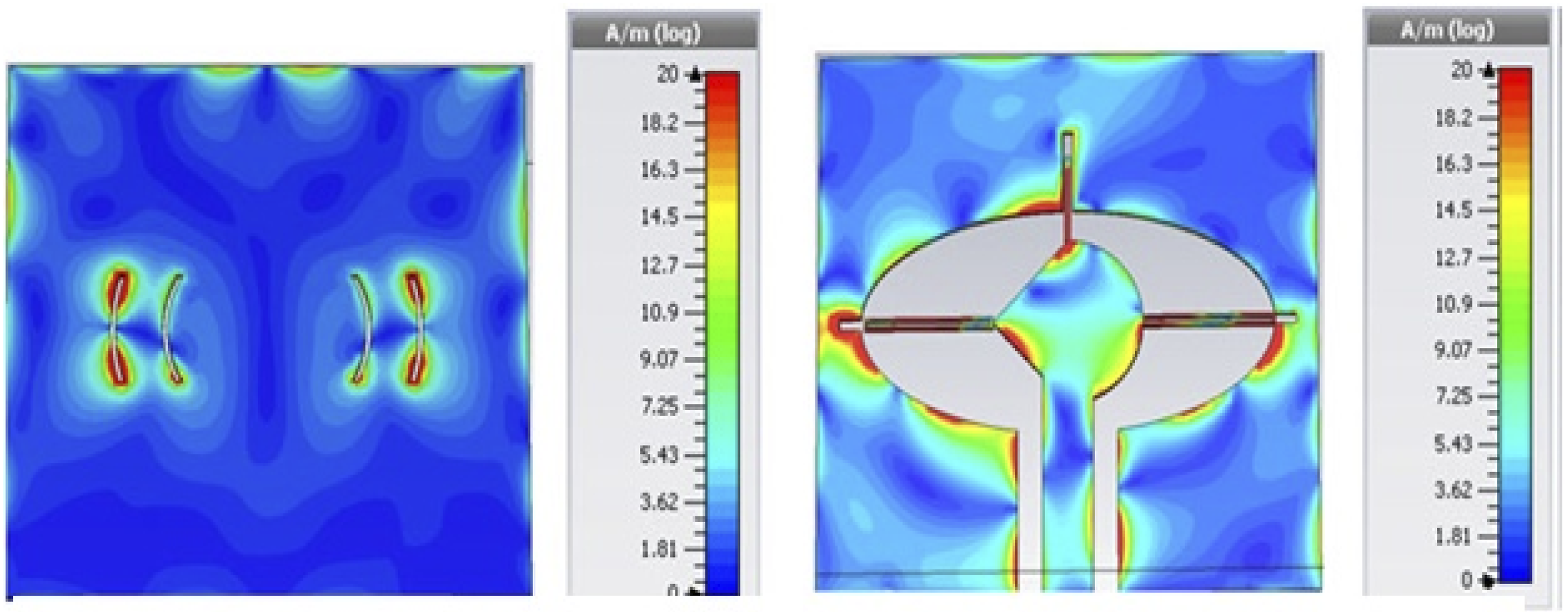 Stubs, DGS, and an elliptical-shaped aperture outside the radiating patch increase the antenna bandwidth. The antenna is built with dimensions that allow it to fit into any small, contemporary Smartphone. Depending on the inductive impact of the DGS structure, the slot in the ground plane disrupts the current distribution and changes the resonance frequency. By tweaking various structures, a certain resonance may be attained since this alters how electromagnetic waves propagate through antenna substrate layers. If the resonance is near to the antenna’s operational band, it may also result in an increased bandwidth; otherwise, multiband antenna may be produced. The parasitic element’s slots, which are indirectly connected with the antenna patch and stubs on the sectored patch antenna, are employed in this situation to boost the bandwidth. The goal is to disrupt the current distribution on the stubs of a radiating patch that is indirectly connected with the DGS ring slot by adding an inverted T-shaped metallic patch surrounding sectored radiators, which dramatically enhanced the bandwidth of each band. The slot width, ring diameter, split ring percentage, and slot placement are some of the design elements that determine the antenna impedance characteristics. To determine the antenna dimensions, a parametric analysis of the design parameters was carried out at this stage of the modelling process. The ground’s centre was optimised, and two bracket-ring holes were cut out at the same distance in opposing directions is shown in Figure 9. Because of its low number of minor lobes, the antenna is also suitable for wearable applications. Current distribution of the T-shaped structure.