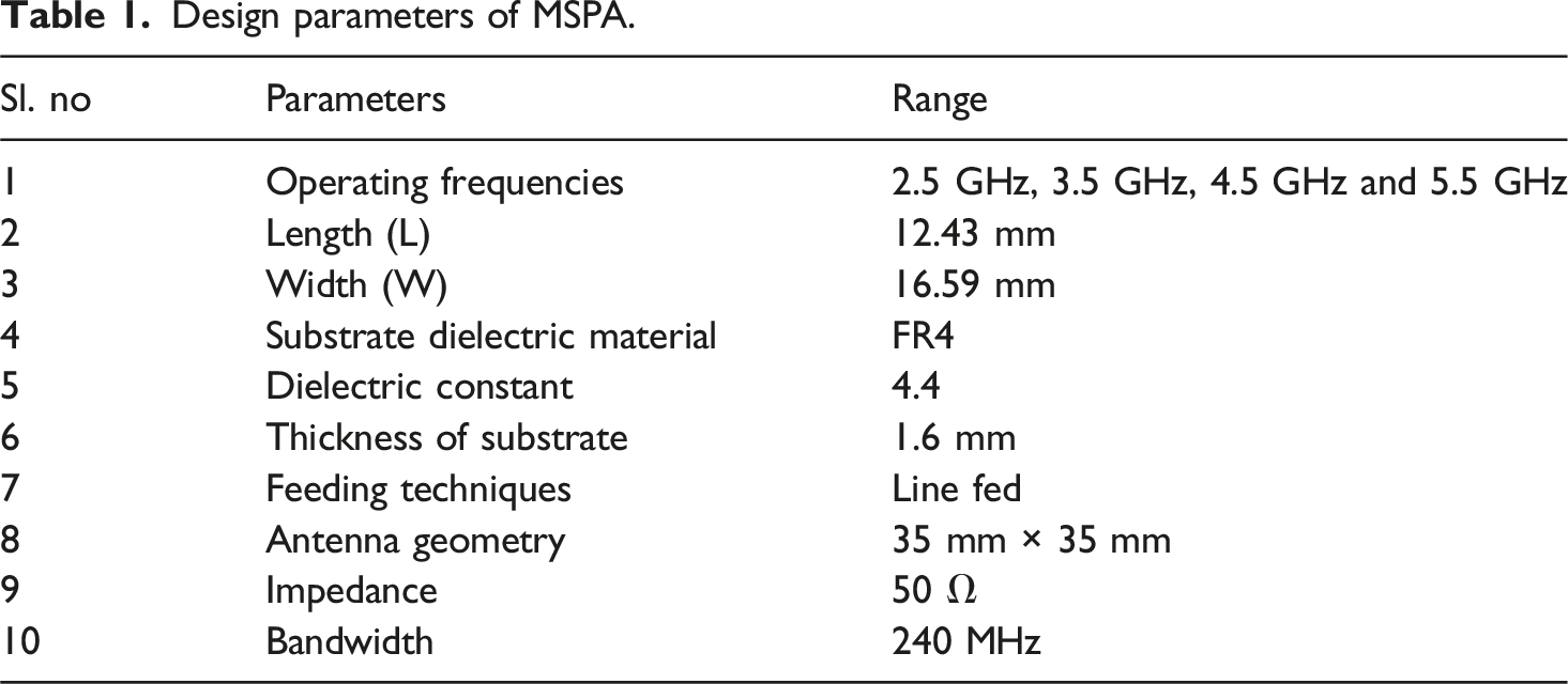 Micro-strip patch antennas are becoming increasingly common in applications that need a small footprint. These antennas are used in satellite communications, GPS, mobile phones, missile systems, and military applications. The low profile, ease of construction, cheap fabrication costs, effective radiators, and ease of integration with complex microwave circuits all contributed to the selection of these antennas. Limitations in broadband, extra radiation from feeds and connections, and surface wave radiation are all disadvantages. There are a number of options for boosting bandwidth. Figure 1 depicts a proposed design for a MSPA. Proposed structure of MSPA.