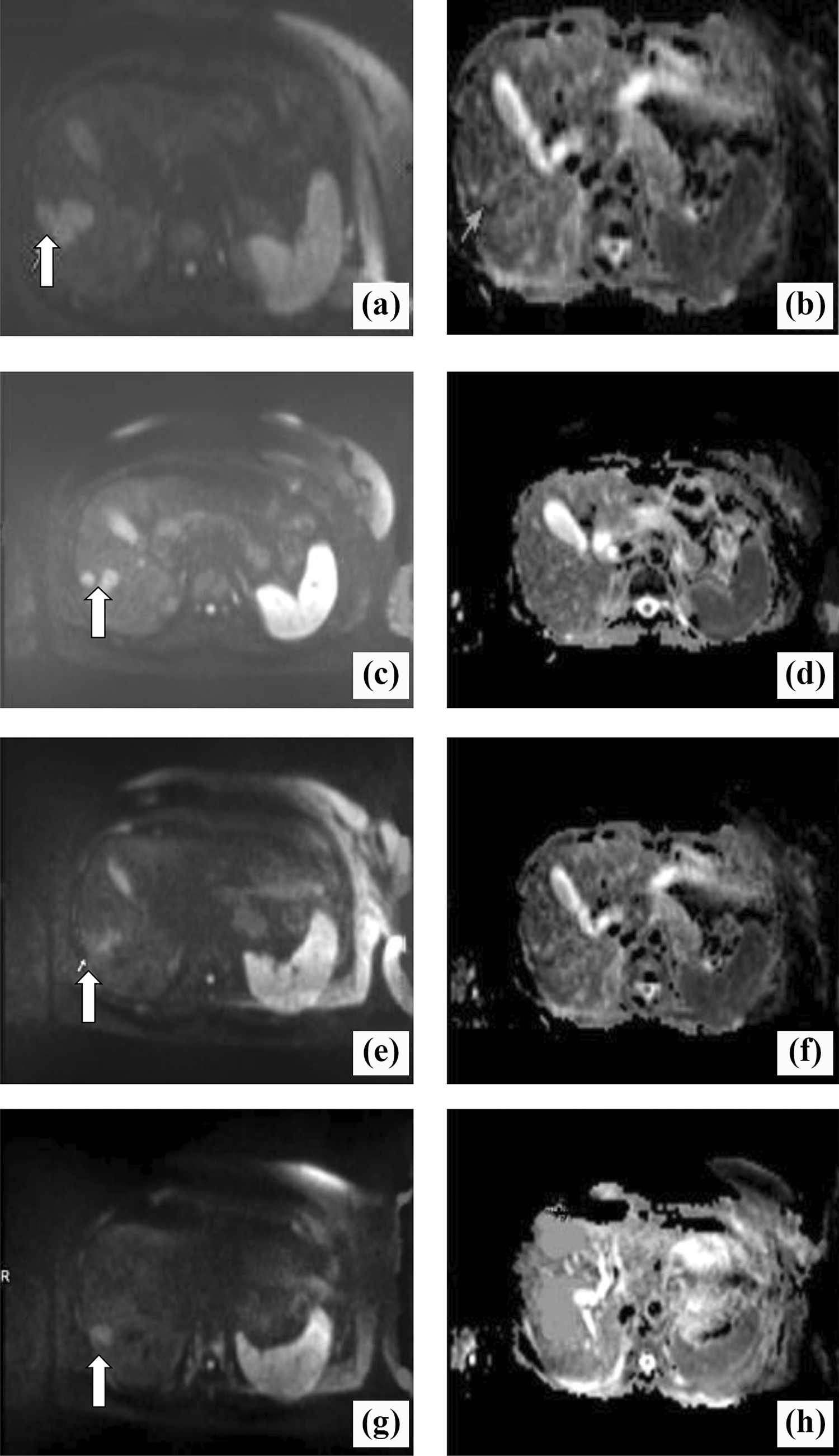 A 54-year-old patient with breast cancer liver metastases (BCLM) who received chemotherapy: (A and B) 3 to 4 days before chemotherapy; (C and D) 1 week after chemotherapy; (E and F) 2 weeks after chemotherapy; (G and H) 4 weeks after chemotherapy. In the diffusion-weighted magnetic resonance (DW-MR) images (A, C, E, F), the white arrow indicates the marker metastatic lesion located in the right lobe evaluated for dimensional and apparent diffusion coefficient (ADC) changes. Dimensional reduction is clearly visible at the early stage (C, E). The ADC maps show a consecutive increase in ADC(×10−3 mm2/s): 0.96 before chemotherapy (B), 1.07 after 1 week of chemotherapy (D), 1.38 after 2 weeks of chemotherapy (F), and 1.45 after 4 weeks of chemotherapy (H).