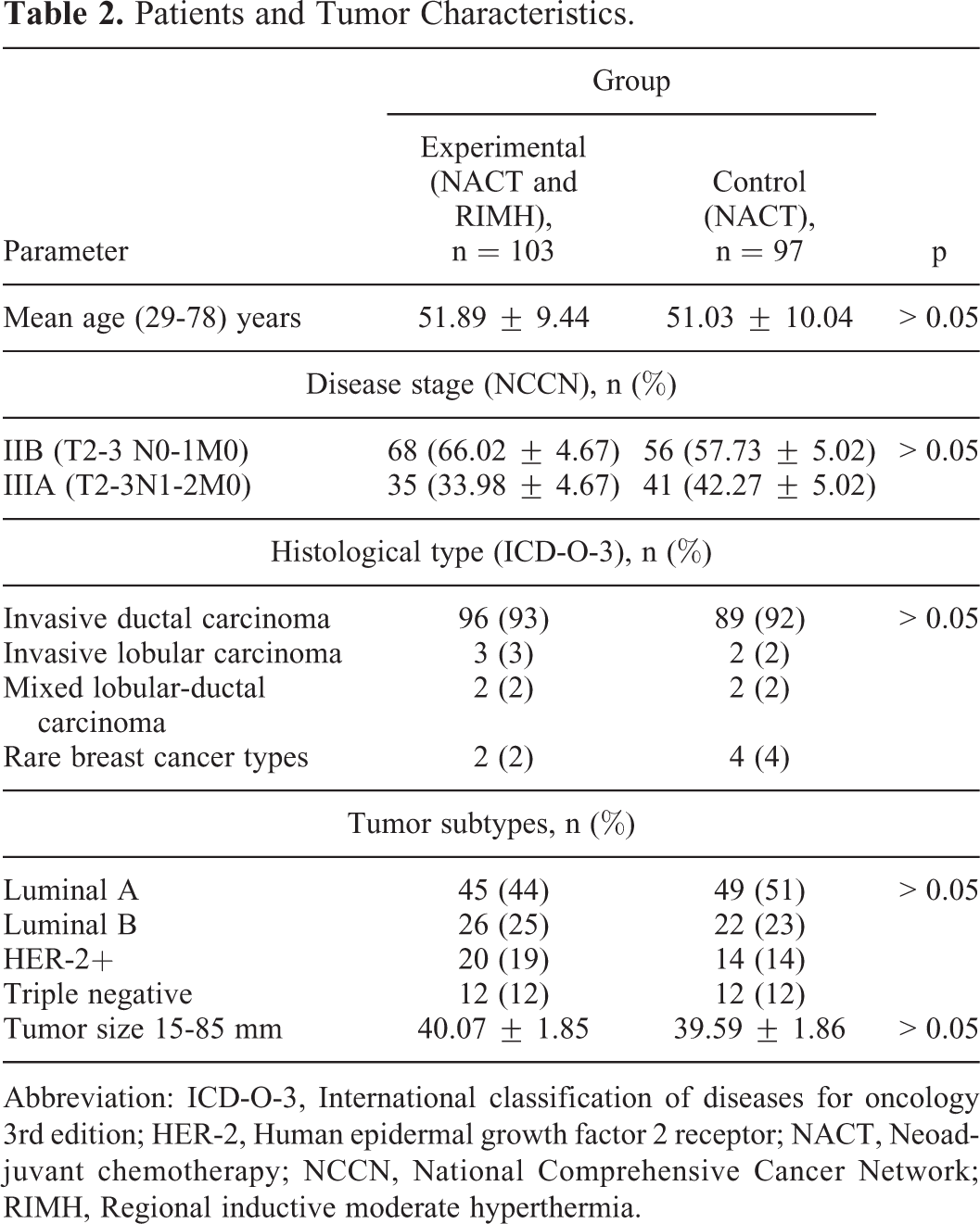 200 patients with locally advanced BC stage IIB to stage IIIA were recruited at the Department of breast cancer and reconstructive surgery, NCI between 2008 and 2017, of whom 97 received NACT and 103 who received NACT + RIMH. Patient characteristics were similar between the 2 groups (Table 2). There were 5 patients in the experimental group and 4 patients in the control group who had a different subtype after NACT. Identified subtypes did not have an impact on treatment outcomes nor required changes. Likewise, no significant differences were found in the molecular profiles of treated BC patients between the primary tumor and regional lymph node metastases after surgery. This observation was in agreement with the linear evolution model for BC, where molecular profiles of primary breast tumors matched those of metastases. 29,30