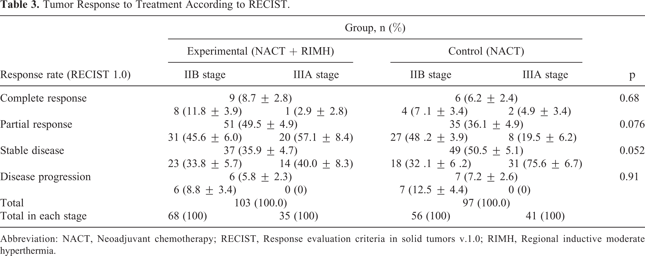 Tumor response rates are summarized in Table 3. Assessment of tumor size found a (31.24 ± 3.85)% reduction in the size of the primary tumor in patients receiving NACT combined with RIMH, while NACT alone showed a (22.95 ± 3.61)% decrease on average (p = 0.034). The objective response was achieved in 58.2% of the patients assigned to the experimental group as compared with 42.3% in the control group (p = 0.034).