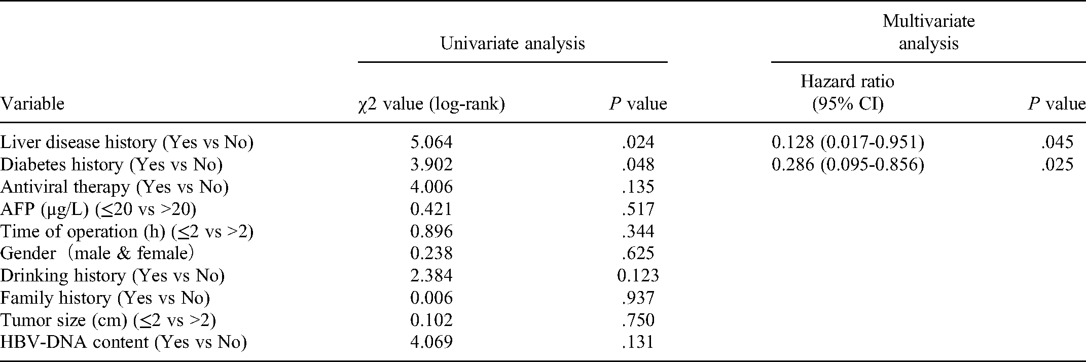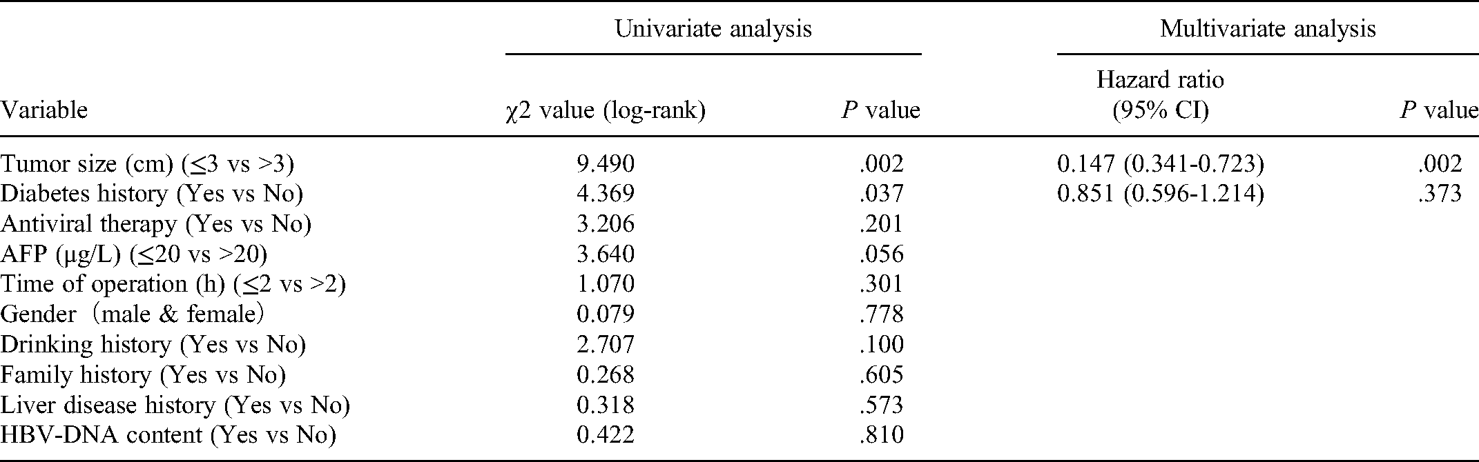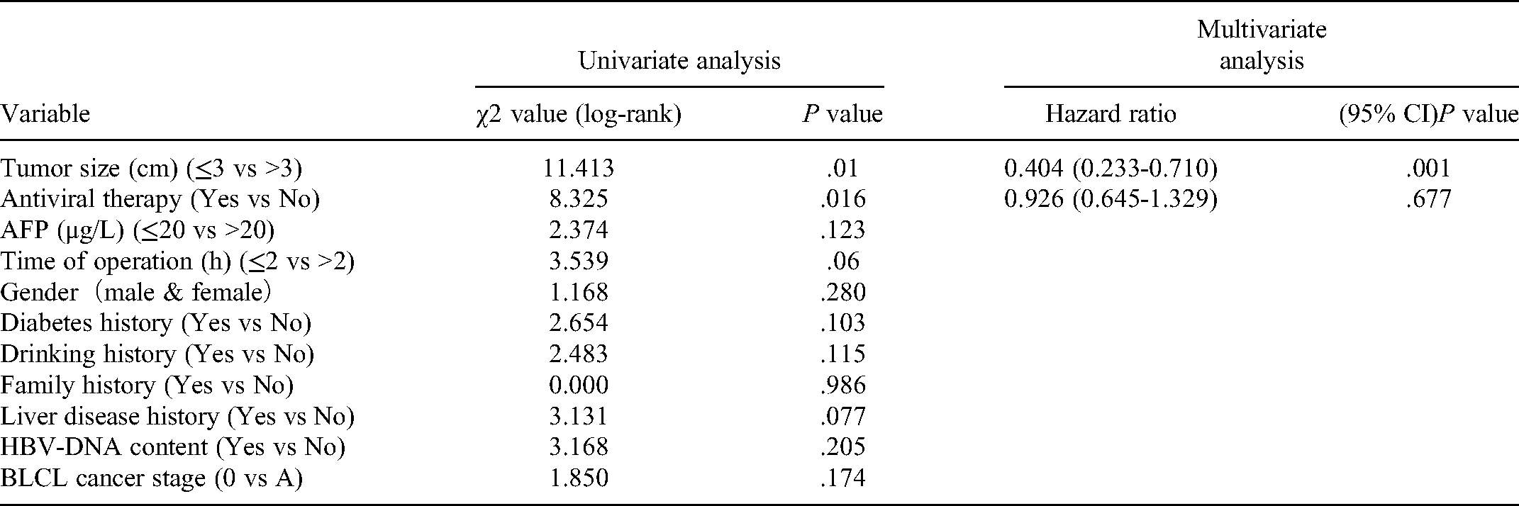 Univariate and multivariate analysis of the relative risk of overall survival for single HCC.