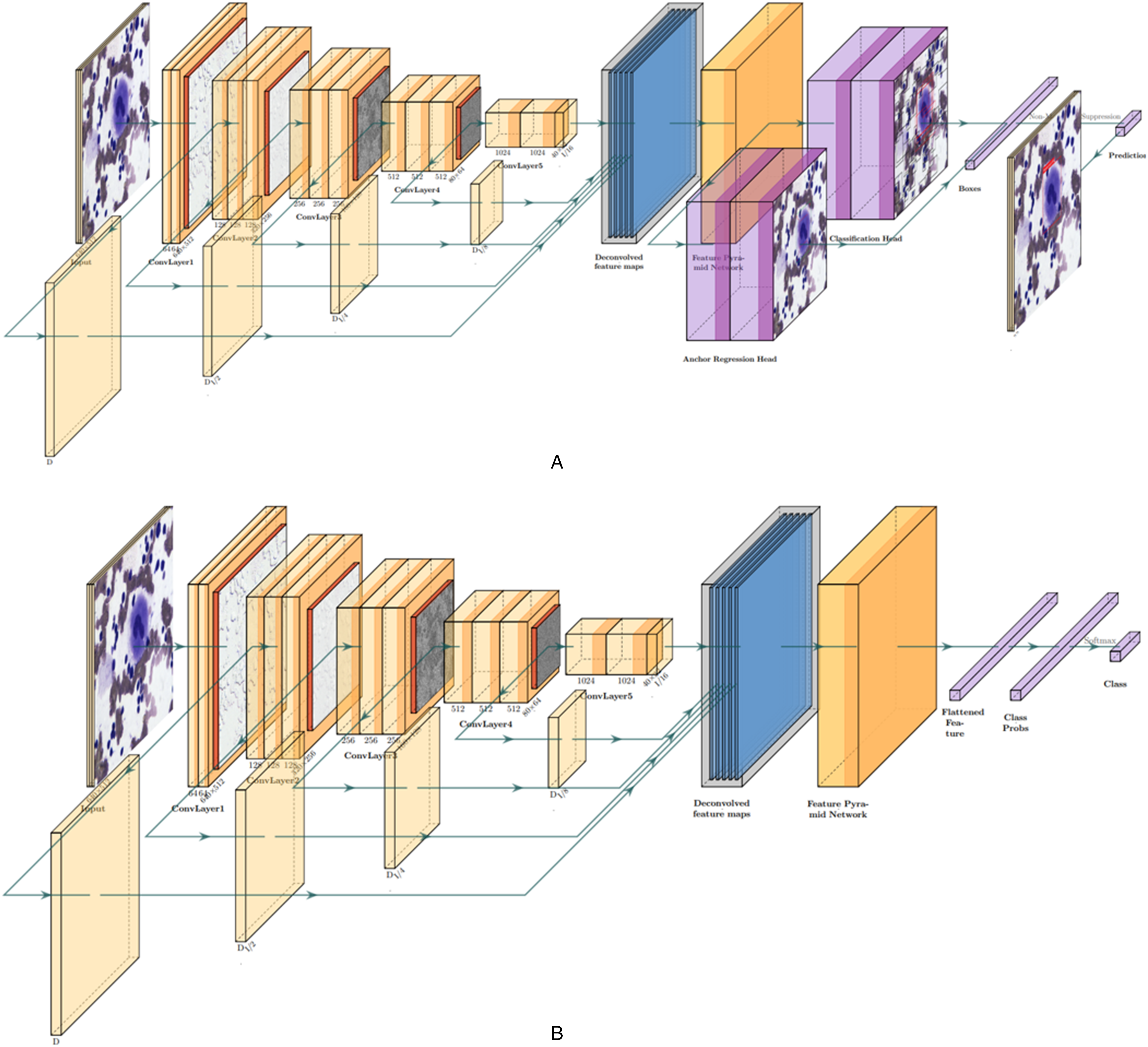 CNN structure of the bone marrow megakaryocyte detection algorithm. (A) Megakaryocyte localization algorithm. (B) Megakaryocyte classification algorithm.