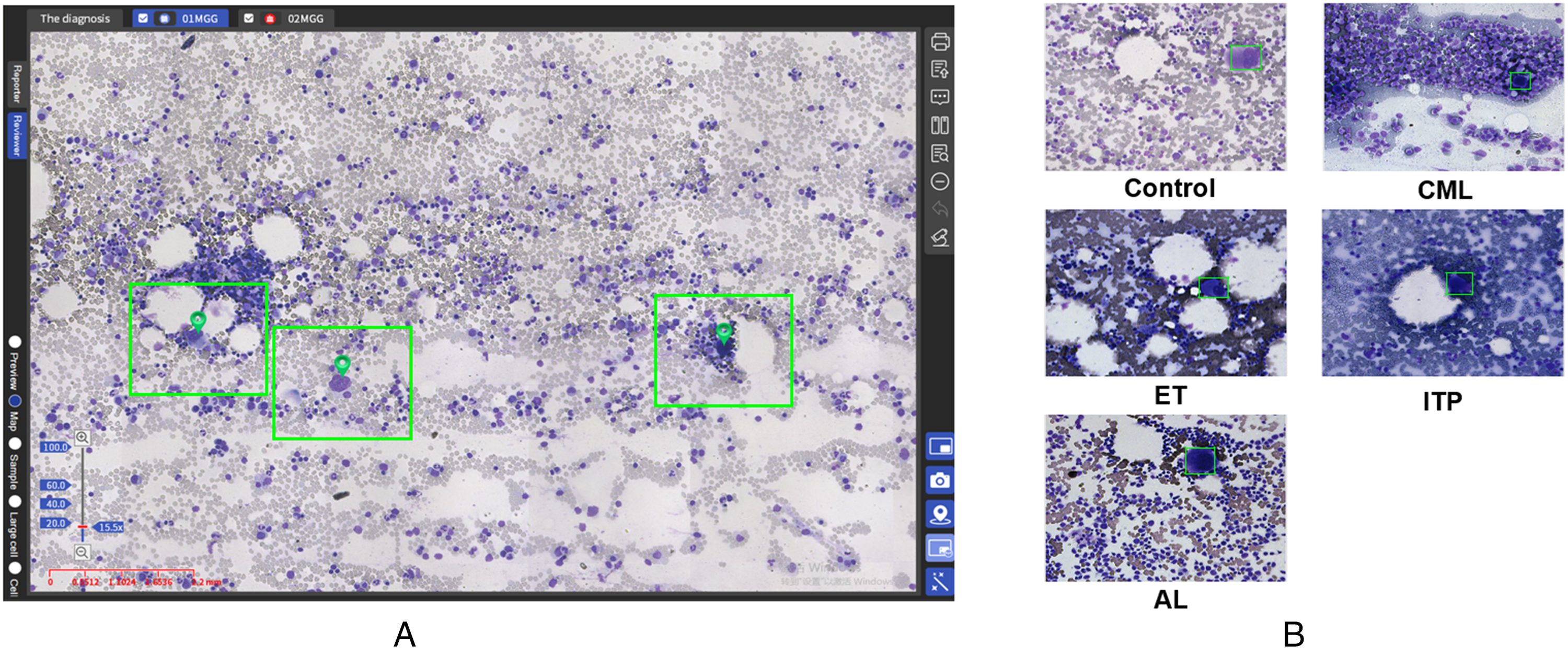 Pathologists using Morphogo system to annotate megakaryocytes. (A) Cell distribution map interface of BM smears on Morphogo system. (B) View of digital smears from each group for megakaryocyte annotation.
