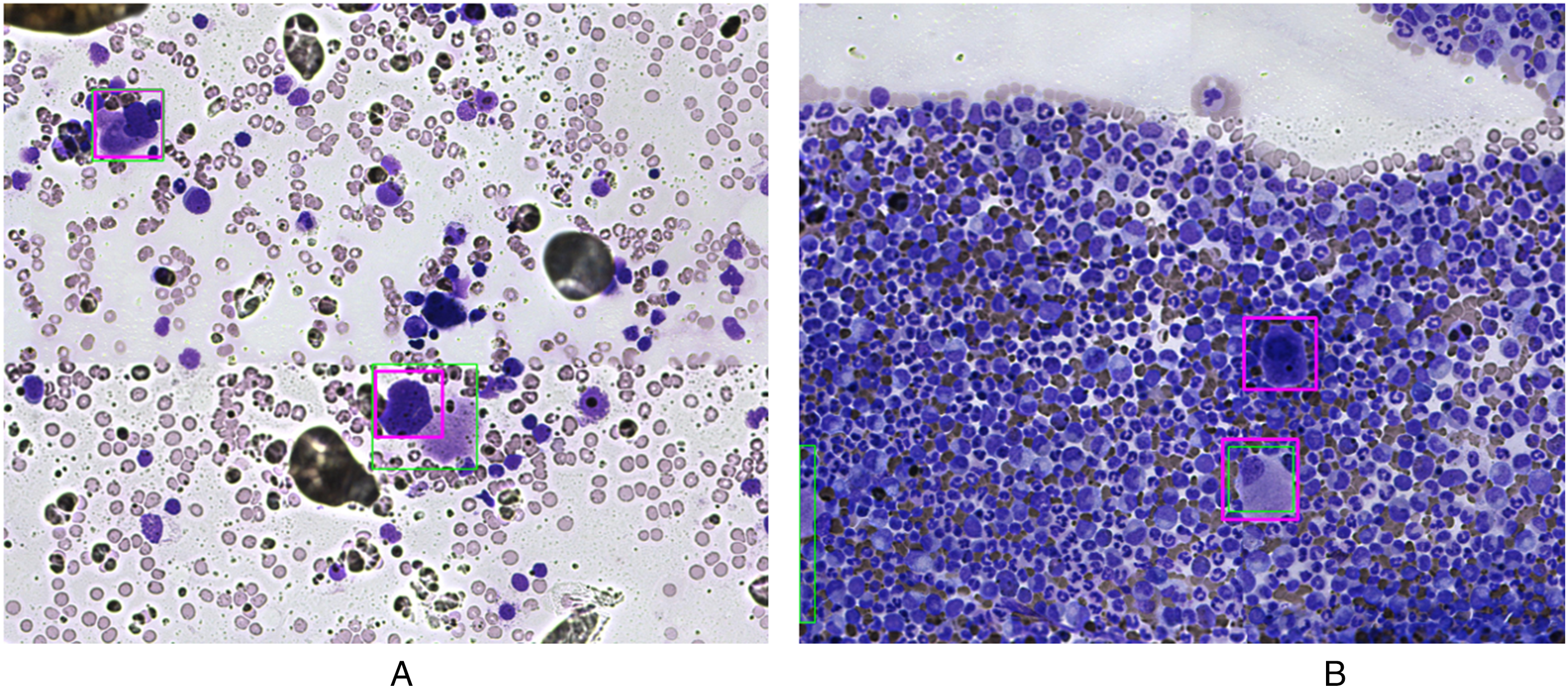 The results of Morphogo system for megakaryocyte identification are compared with the annotations of pathologists. (A) The annotations of the system agree with the pathologist, the red frame is the system annotation and the green frame is the manual annotation. (B) The annotations of the system do not agree with the pathologist.