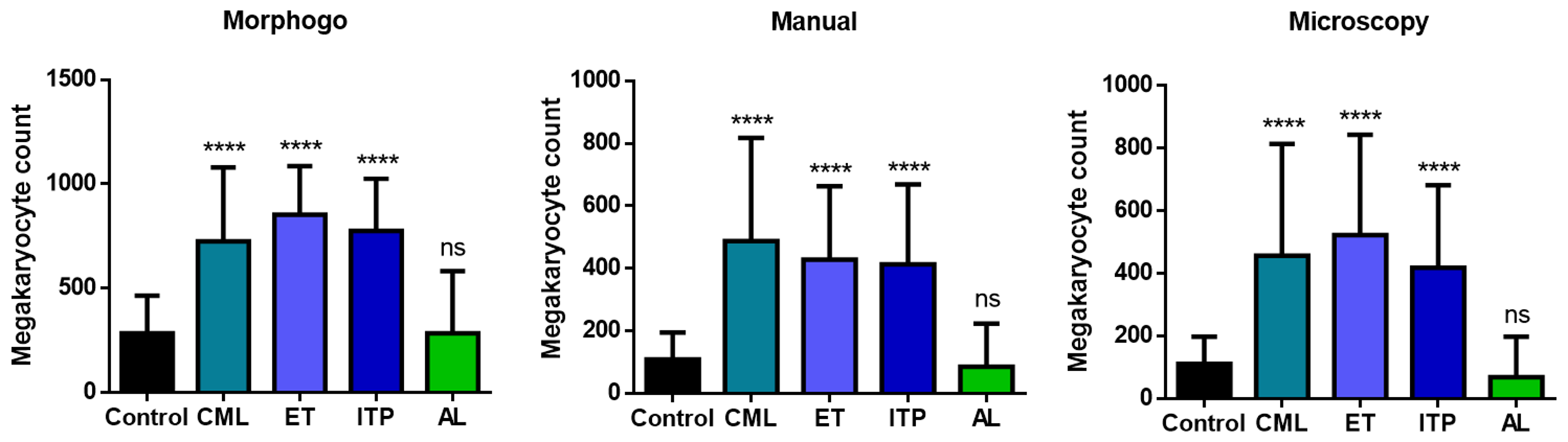 Differential analysis of megakaryocyte counts obtained by the three megakaryocyte counting methods for each group. ****