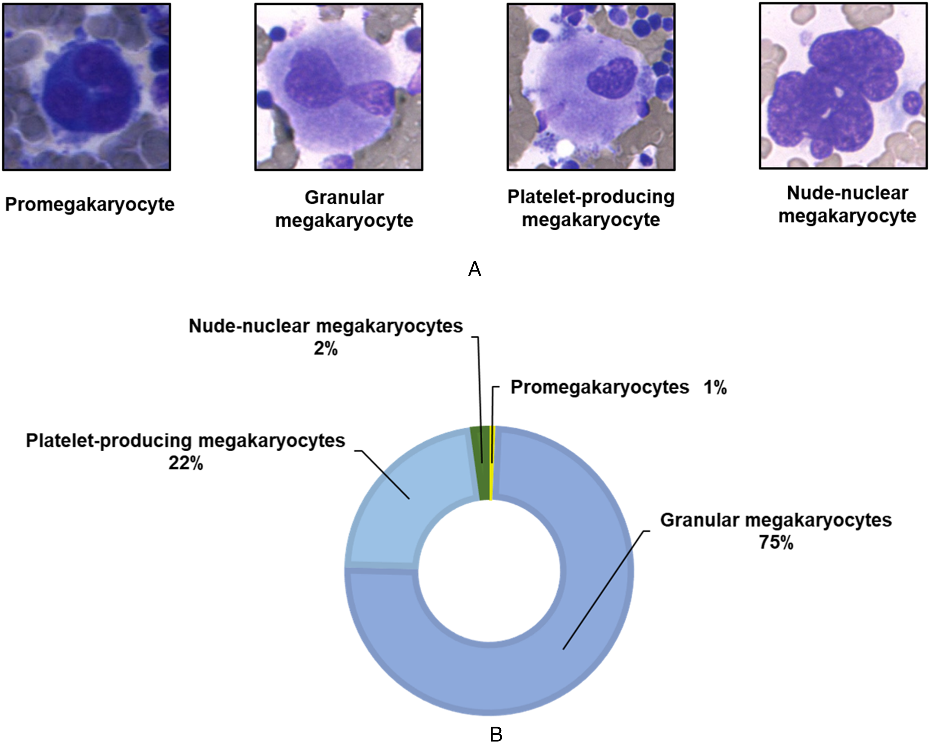 Megakaryocytic series included megakaryoblasts, promegakaryocytes, granular megakaryocytes, platelet-producing megakaryocytes, and nude-nuclear megakaryocytes. The cell ratios of different megakaryocyte types were obtained by Morphogo and microscopy, respectively, to assess the consistency of the two methods of megakaryocyte classification. Morphogo method: Morphogo automatically classifies 25 megakaryocytes in the region of interest (ROI) with 100× oil lens and is reviewed by pathologists. For BM smears with megakaryocytes number ≤25, classification of all megakaryocytes is required. Microscopy method: the cell ratios of different megakaryocyte types were obtained from the pathology report of patients.