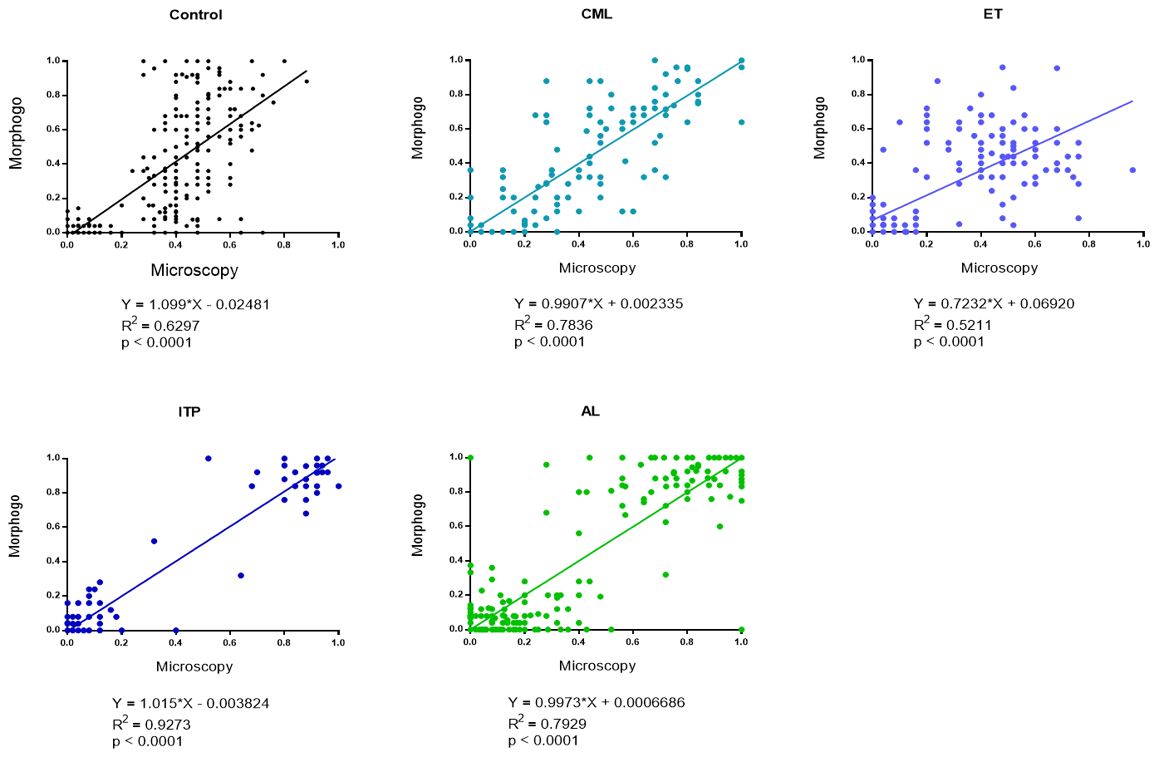 Scatter plots of linear regression lines generated from BM smears of each group of patients after classifying megakaryocytes by Morphogo system and microscopy.