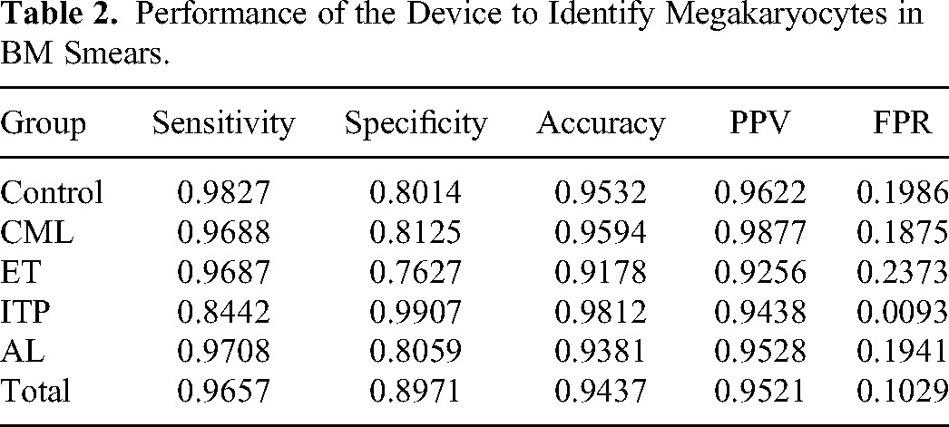 Performance of the Device to Identify Megakaryocytes in BM Smears.