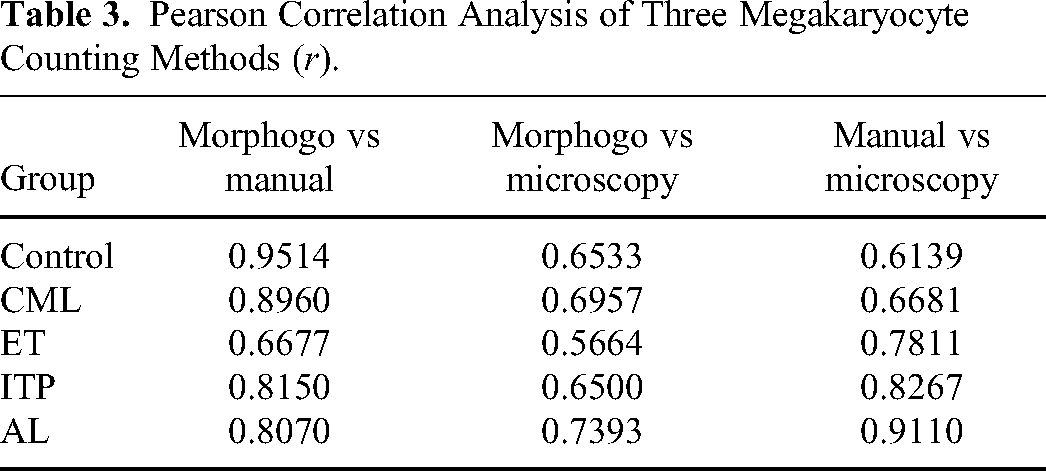 Pearson Correlation Analysis of Three Megakaryocyte Counting Methods (