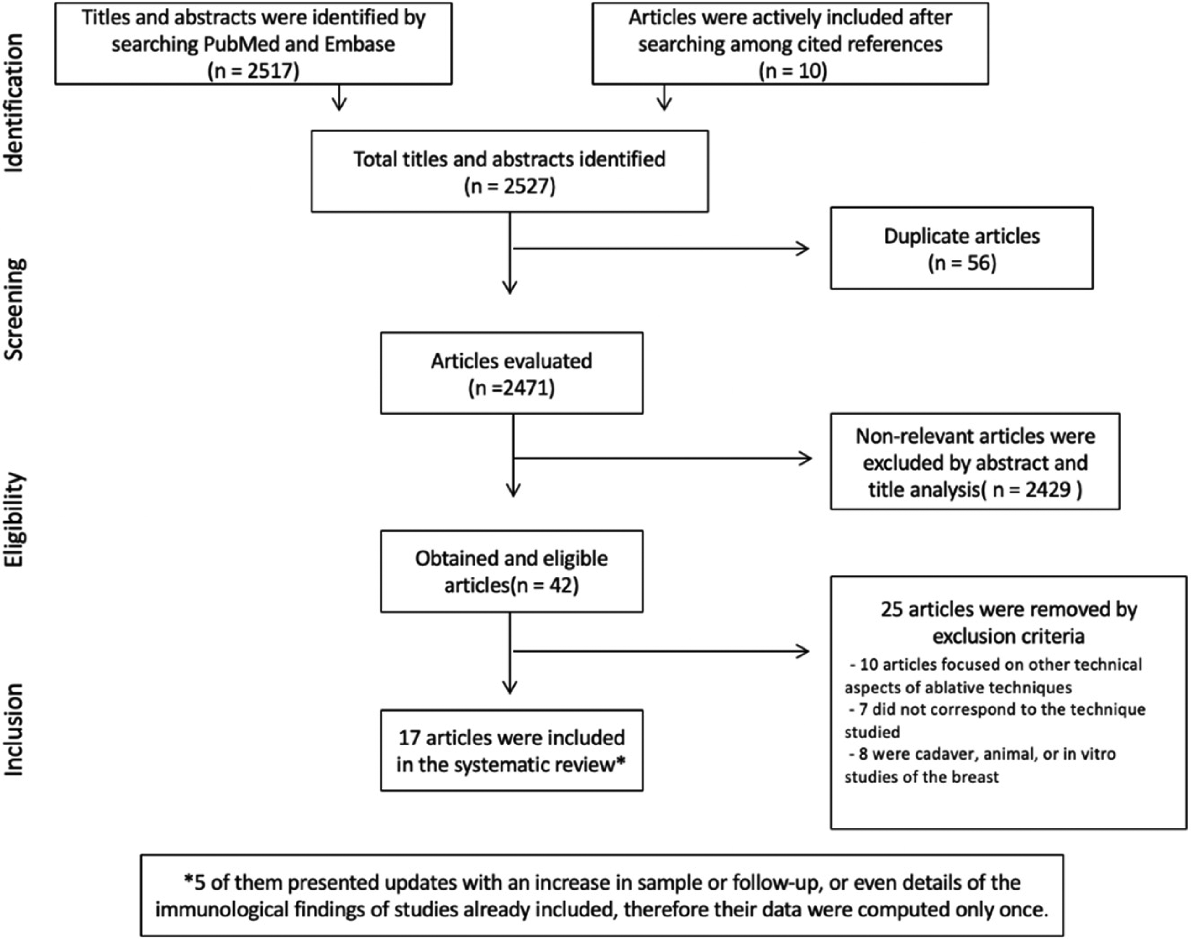 The search yielded 1778 and 739 articles in the Pubmed and Embase platforms, respectively. During the review of the selected articles, 10 studies not previously identified by the search platforms were actively found through references and included for analysis. Among the 2527 total articles, 56 were excluded due to duplication. On reviewing the title and abstract, 2429 studies were excluded because they did not meet the inclusion criteria. Among the 42 articles reviewed, 25 were excluded because they referred only to technical or pathological aspects or image analysis (10 articles); did not correspond to the technique studied (7 articles); or were conducted on cadaver, animal, or