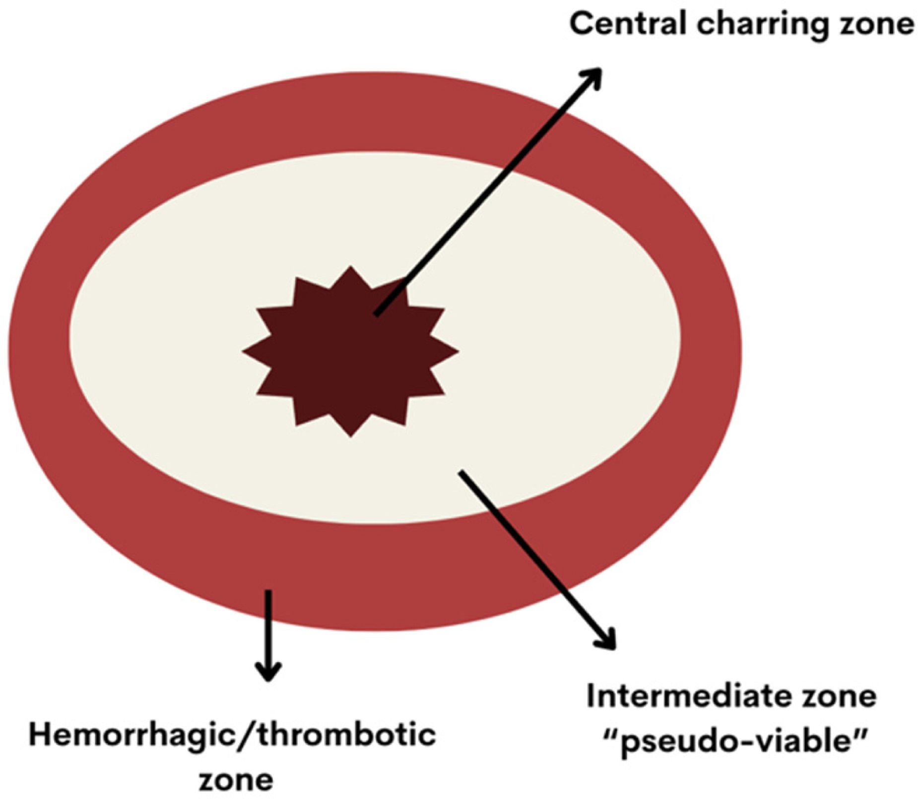 The central charring zone is composed of charred necrotic debris. Immediately adjacent to this zone, signs similar to electrocautery artifacts are observed;17,24 The intermediate or “pseudo-viable” zone, wherein cells seem morphologically normal or “mummified”,24 displays no signs of necrosis, increased apoptosis, or inflammation. The nuclei of these cells are hyperchromatic. The cytoplasm is eosinophilic and no longer exhibits its usual characteristics.