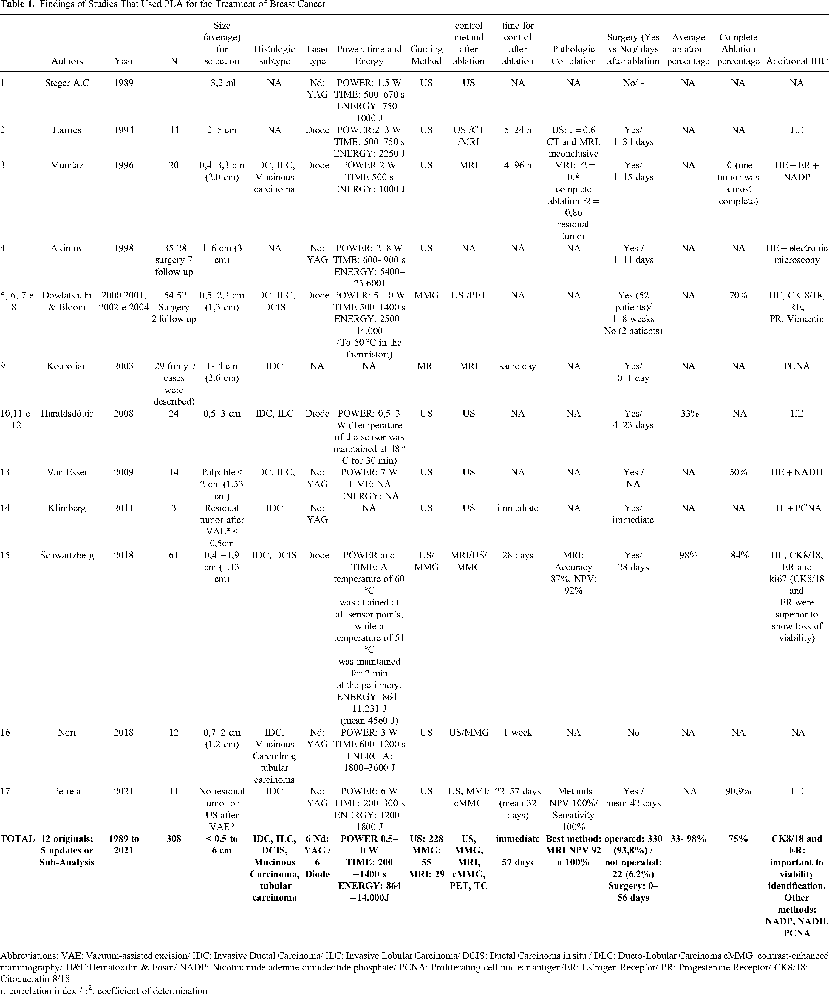 Two studies assessed PLA as an additional method after vacuum-assisted excision (VAE). In the study by Klimberg et al, 3 patients with tumors smaller than 1.5 cm underwent ablation immediately following VAE and surgical excision soon after. The area of necrosis and the images after ablation were incompatible on pathological examination, and the authors judged that the behavior of the ablation in the hematoma cavity presented different aspects from those observed in the tumor. They concluded that PLA was unsafe immediately following VAE22 . Meanwhile, Perreta et al conversely selected 11 patients with invasive carcinoma smaller than 1 cm for VAE followed by PLA.23 The equipment used was an Nd:YAG laser. The power was programmed at 6 W, and the target power ranged between 1200 and 1800 J. After ablation, the patients underwent imaging with US, MRI, or contrast-enhanced MMG (cMMG). Of the 11 selected cases, 10 (90.9%) had complete pathologic response. Collectively, the post-ablation imaging methods, in this study with a small number of cases, displayed a sensitivity and negative predictive value (NPV) of 100%.23