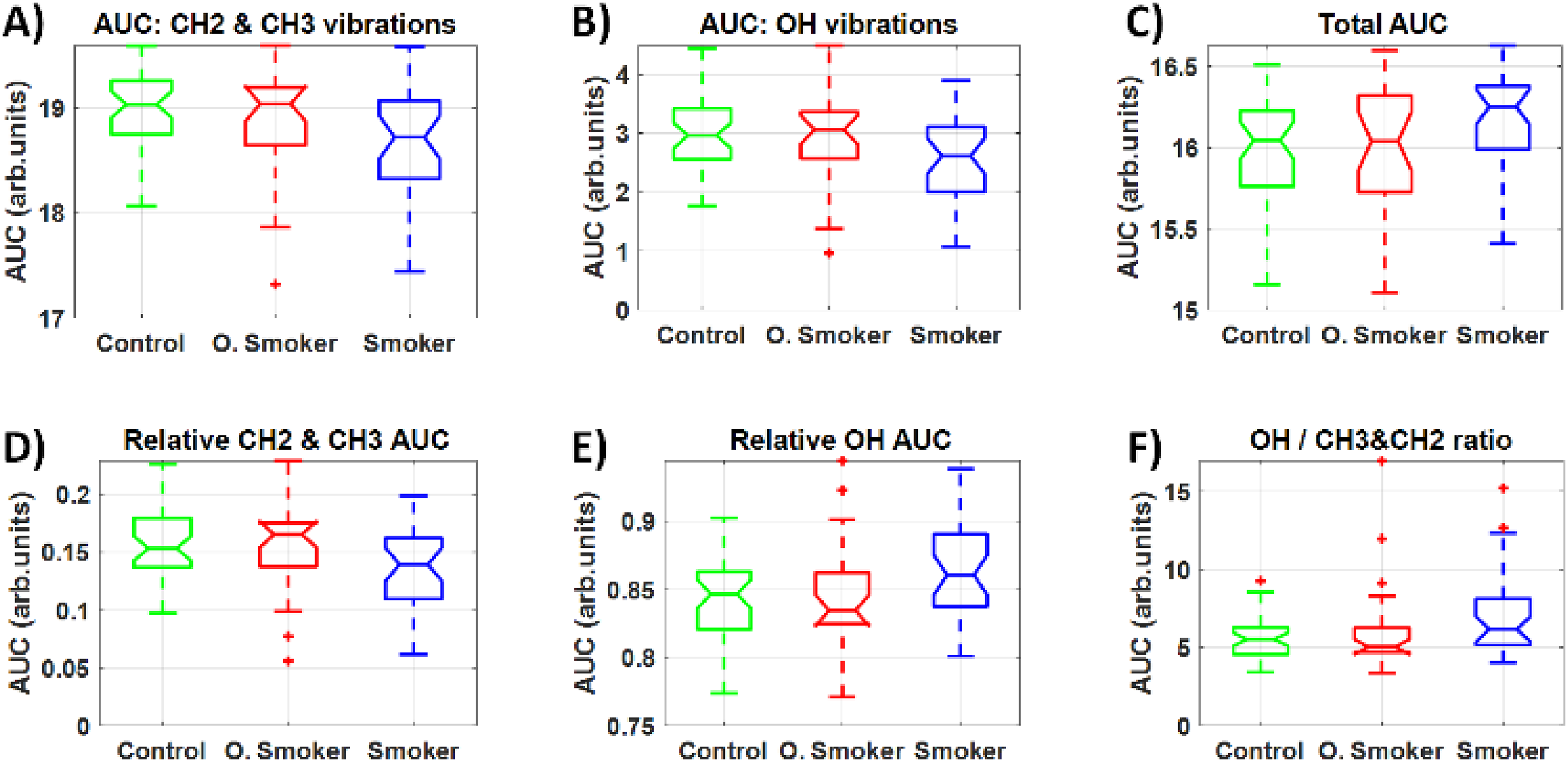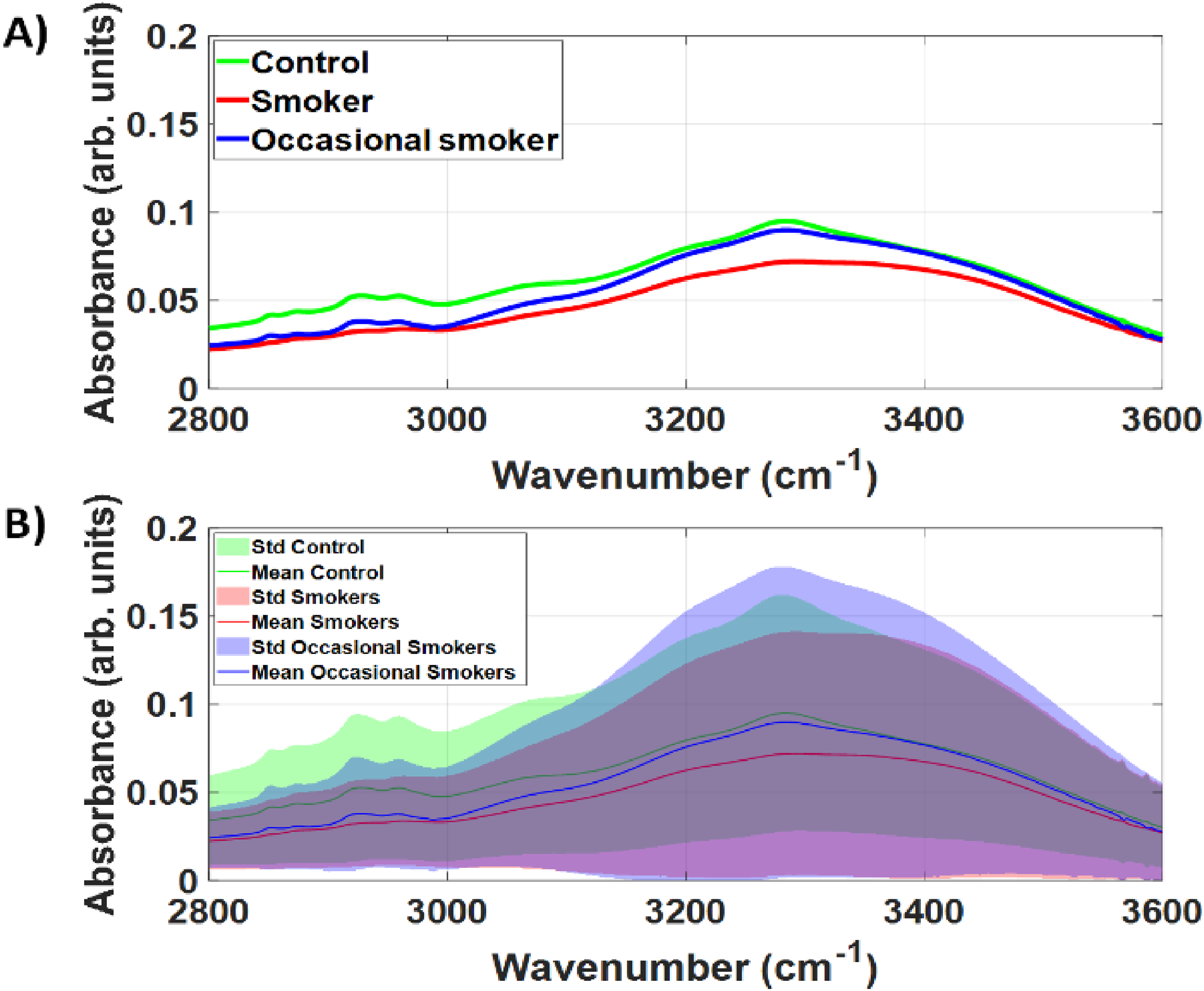 The high-wavenumber spectral region from 2800–3600 cm−1 was selected for FTIR spectral analysis. To evaluate the existence of statistically significant differences between saliva samples of control (n = 11), smoker (n = 9), and occasional smoker (n = 8) groups, three-way ANOVA and post hoc tests were used to evaluate the area under the curve of FTIR absorption bands for the wavenumber range of specific bands. Metrics of CH, OH, and NH vibrations of water and proteins were considered coming from the 3050–3600 cm−1 band, whereas CH2 and CH3 vibrations of lipids and proteins were assumed to originate from the 2800–3050 cm−1 spectral region.