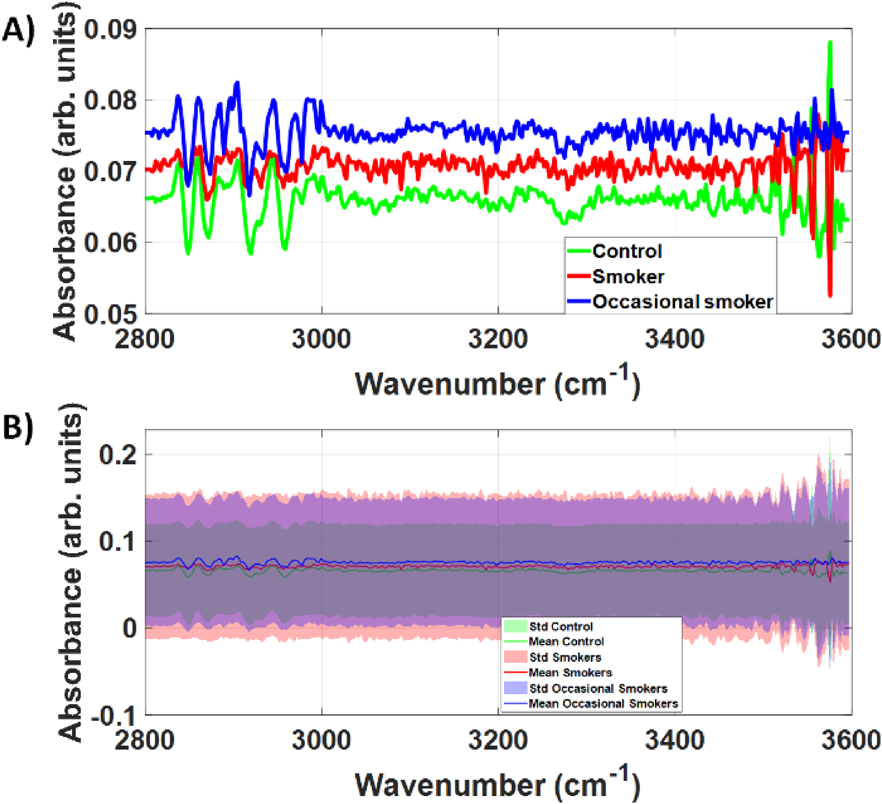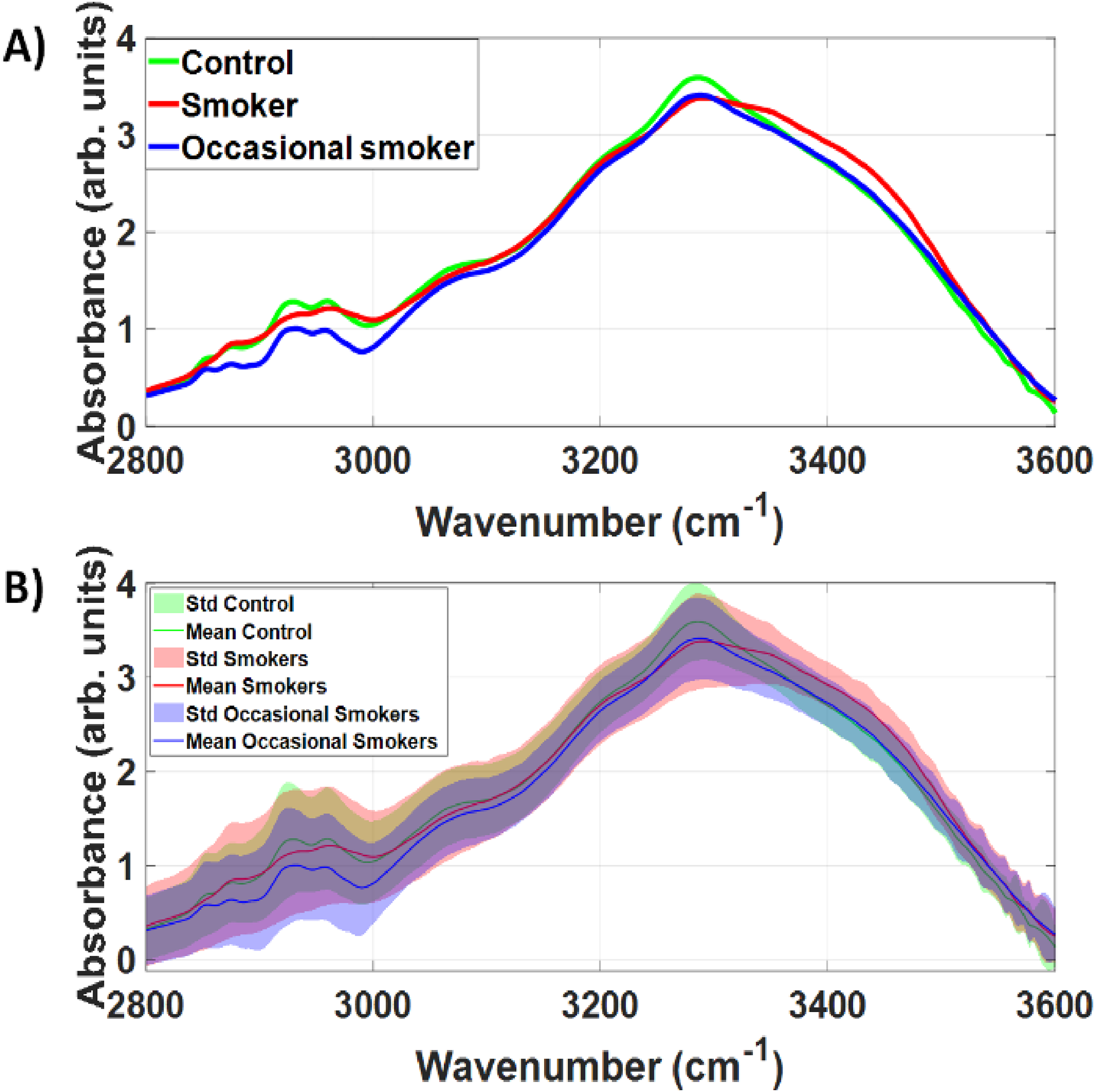 A) and B) Mean and standard deviation of high-wavenumber region of the raw FTIR spectra collected in this study.