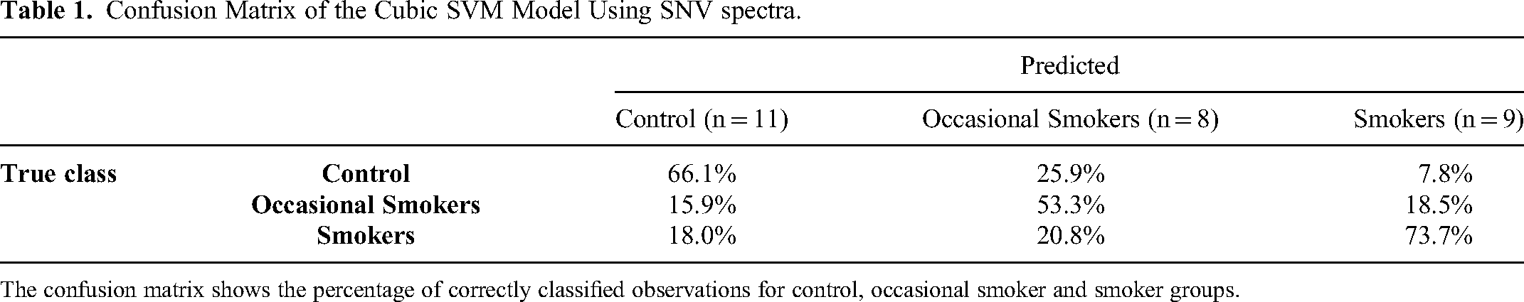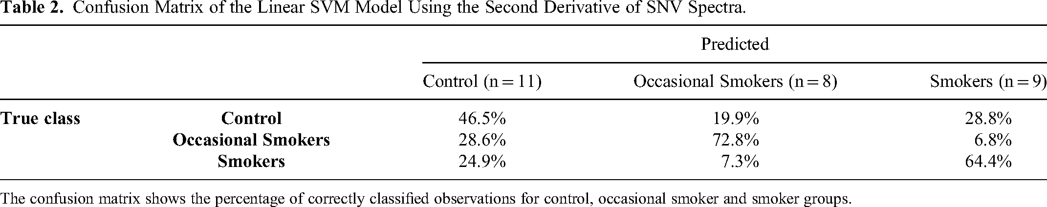 The confusion matrix shows the percentage of correctly classified observations for control, occasional smoker and smoker groups.