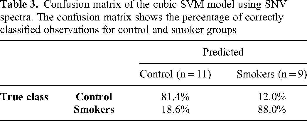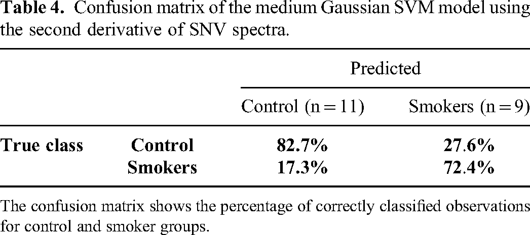 Since SNV spectra were more accurate to classify control and smoker groups, we evaluated the increase in sensitivity and specificity obtained by considering both low and high frequencies of the SNV spectra. This evaluation includes a comparison between results of the most accurate classification models based on SNV spectra and second derivative spectra for only control and smoker groups. Tables 3 and 4 indicate that the cubic SVM model based on SNV spectra achieved 15.6% more sensitivity and 1.3% less specificity compared to the medium Gaussian SVM model based on second derivative spectra.