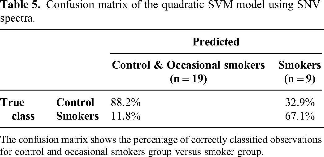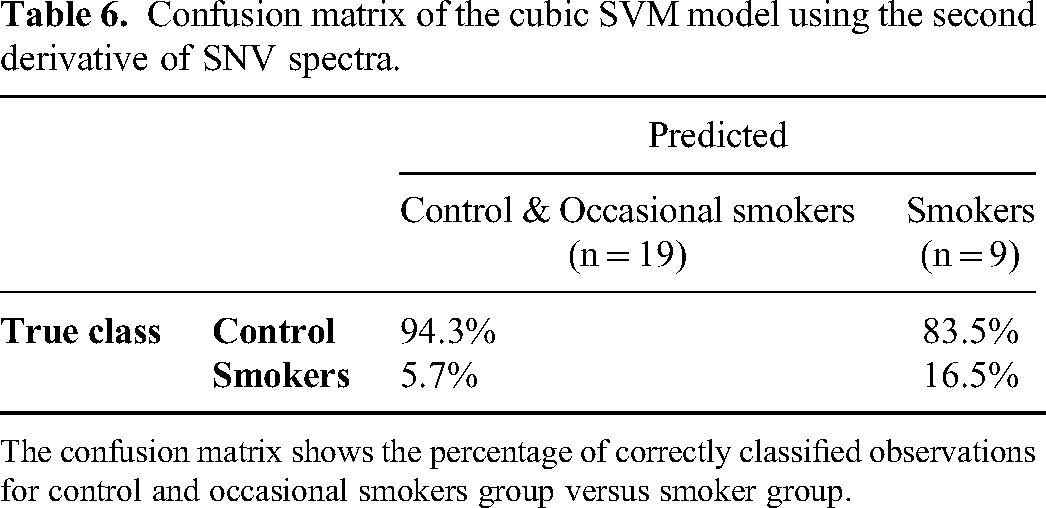 Tables 1 and 2 show that the cubic SVM model was most accurate to classify study groups based on SNV spectra, whereas the linear SVM was most accurate model for classification using the second derivative spectra. When building classification models for control, occasional smoker and smoker groups, the cubic SVM model based on SNV spectra was more accurate to classify between control and smoker groups. Similarly, the cubic SVM model based on second derivative spectra was more accurate to classify between occasional smoker and smoker groups. Therefore, the high frequencies of SNV spectra featured in its second derivative may be associated with the biochemistry of smoking frequency and dependence.