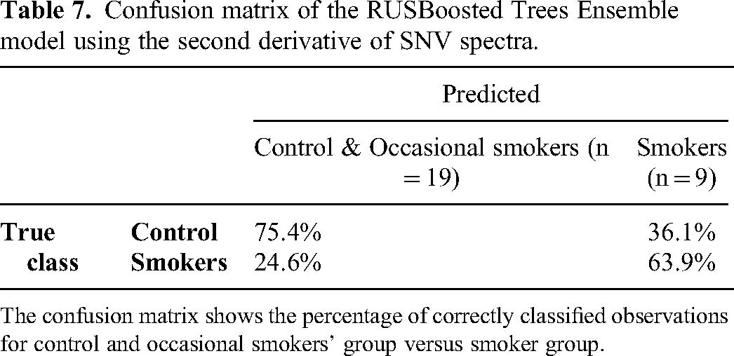The confusion matrix shows the percentage of correctly classified observations for control and occasional smokers’ group versus smoker group.