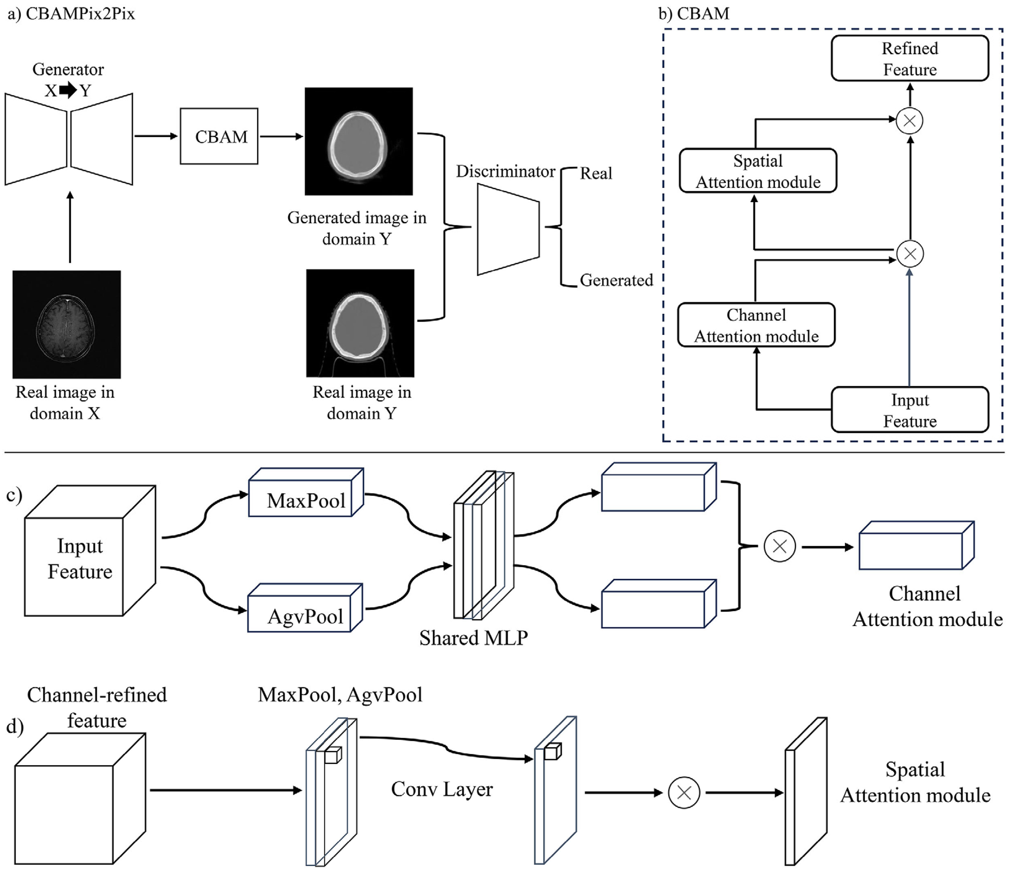 To enhance the classic Pix2Pix model, we introduced the CBAM to create the CBAMPix2Pix architecture, thereby boosting the model's feature capturing and representing abilities. The overall architecture is illustrated in Figure 1. CBAM, a lightweight attention module, combines channel and spatial attention mechanisms. It first employs channel attention to learn channel importance and then feeds the output into the spatial attention module to learn spatial position weights. This process adaptively recalibrates input feature maps, enabling the model to focus on key channels and spatial positions. This allows the network to better capture important features and improves its performance in image-to-image translation tasks. The generator in the original Pix2Pix model uses residual blocks to capture image context and multi-scale features, while the discriminator assesses the authenticity of generated images. However, Pix2Pix has limitations in handling complex scenes and fine-grained details. By incorporating CBAM into the Pix2Pix framework, our CBAMPix2Pix model addresses these limitations and achieves better results in generating synthetic CT images from MRI data.