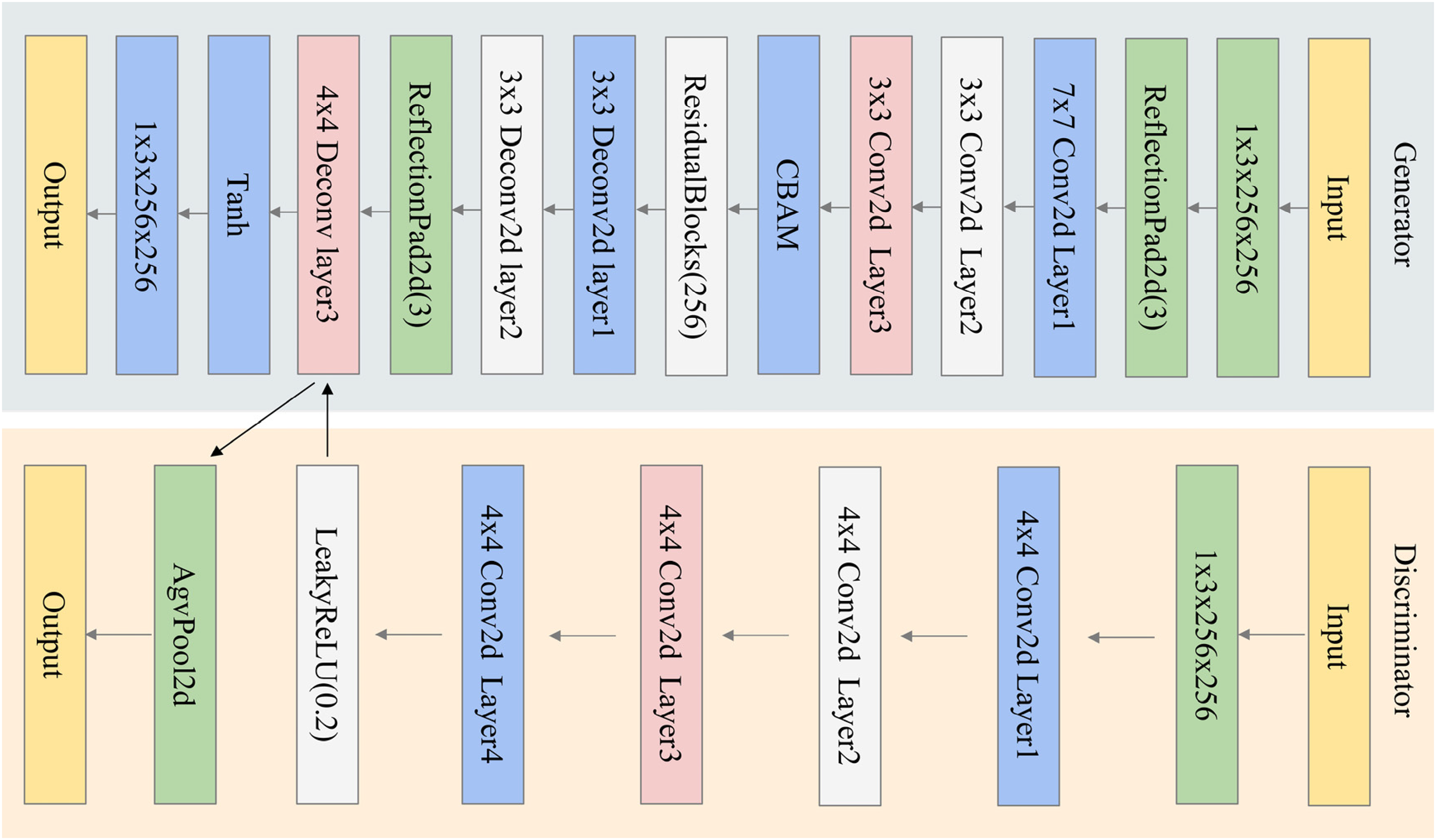 Figure 2 presents the architecture of the modified generator utilized in this study. In the CBAMPix2Pix generator, a CBAM was incorporated before the residual blocks to enhance feature extraction. The feature map first undergoes convolution to extract preliminary features, then enters the CBAM module. Within CBAM, the channel attention module employs global average and max pooling alongside a shared multilayer perceptron (MLP) to generate a channel attention map. This map weights the feature map's channels, amplifying important ones and suppressing less relevant ones. Subsequently, the weighted feature map enters the spatial attention module, which calculates the importance of each spatial position to produce a spatial attention map. This further emphasizes key spatial regions by weighting the spatial positions of the feature map. After undergoing CBAM processing, the feature map proceeds to the up-sampling stage. This design enables the generator to more accurately capture image details and semantics, resulting in higher-quality image generation. It enhances feature capture, focuses on key image regions, reduces noise and irrelevant features, and boosts the model's expressiveness. This allows it to better preserve image details and textures during generation, resulting in more realistic and accurate images.