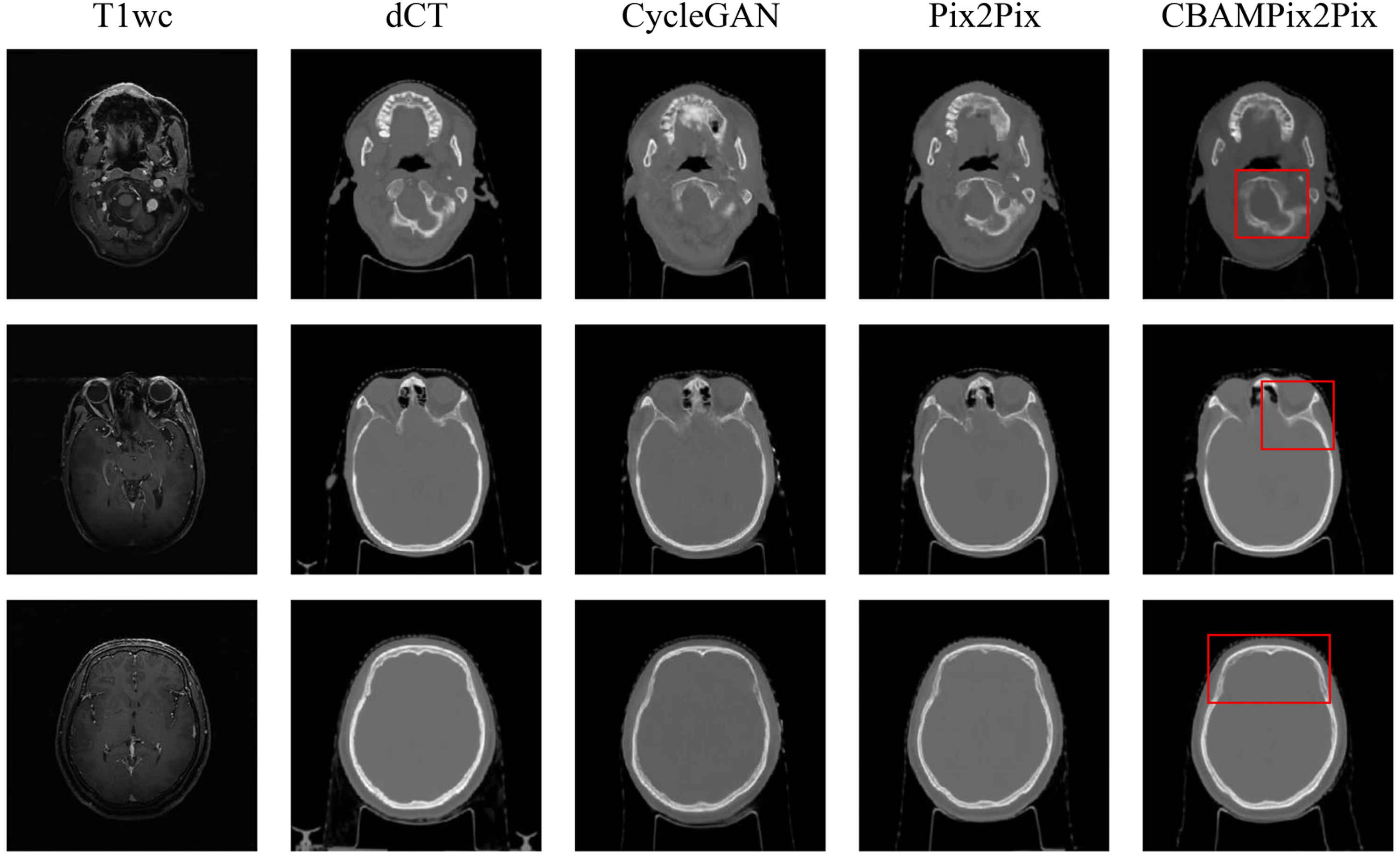 The three models were trained in 36 (CycleGAN), 16 (Pix2Pix), and 17(CBAMPix2Pix) hours, respectively. Once the models have been trained, it took a few seconds to generate sCT images from new MR volume image. Figure 3 shows the visual comparison at different anatomical locations, which contains the axial view of the original MR, the corresponding dCT, and sCT images generated from CycleGAN, the Pix2Pix, the proposed CBAMPix2Pix. In the visual inspection, the generated results of our method are more consistent with the dCT compared with other two methods in terms of global and local imaging regions. As can be seen in Figure 3, the sCT generated using CBAMPix2Pix showed sharper boundaries than the sCT generated using the original CycleGAN and Pix2Pix.