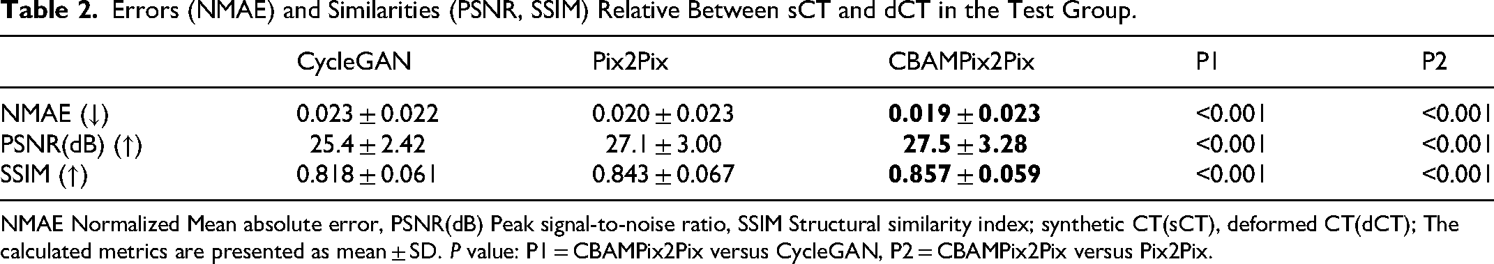 NMAE Normalized Mean absolute error, PSNR(dB) Peak signal-to-noise ratio, SSIM Structural similarity index; synthetic CT(sCT), deformed CT(dCT); The calculated metrics are presented as mean ± SD.