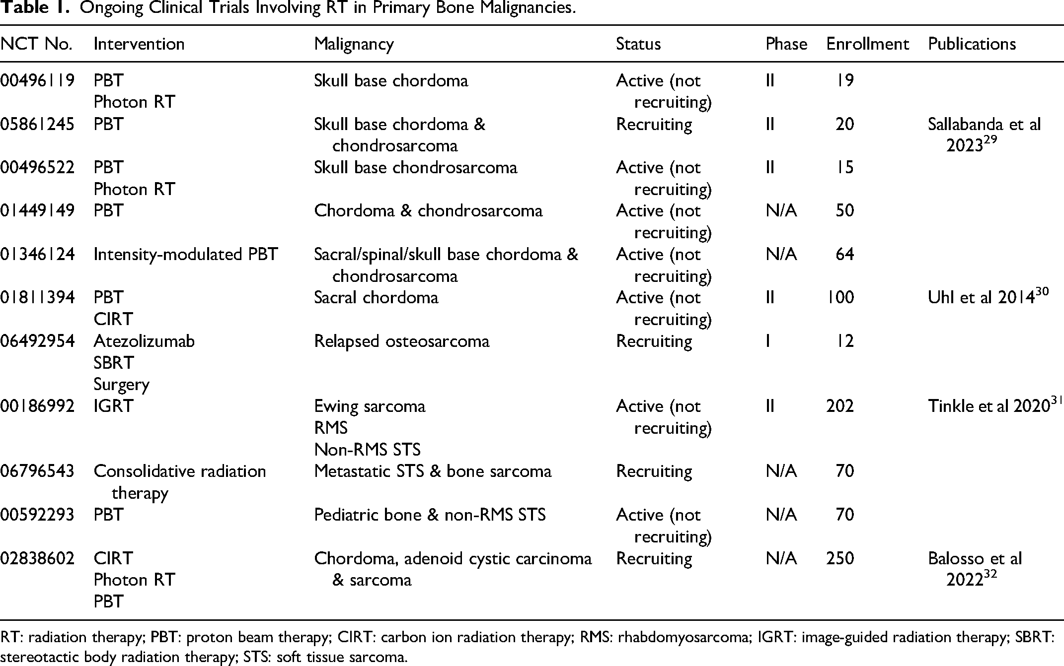 Ongoing Clinical Trials Involving RT in Primary Bone Malignancies.