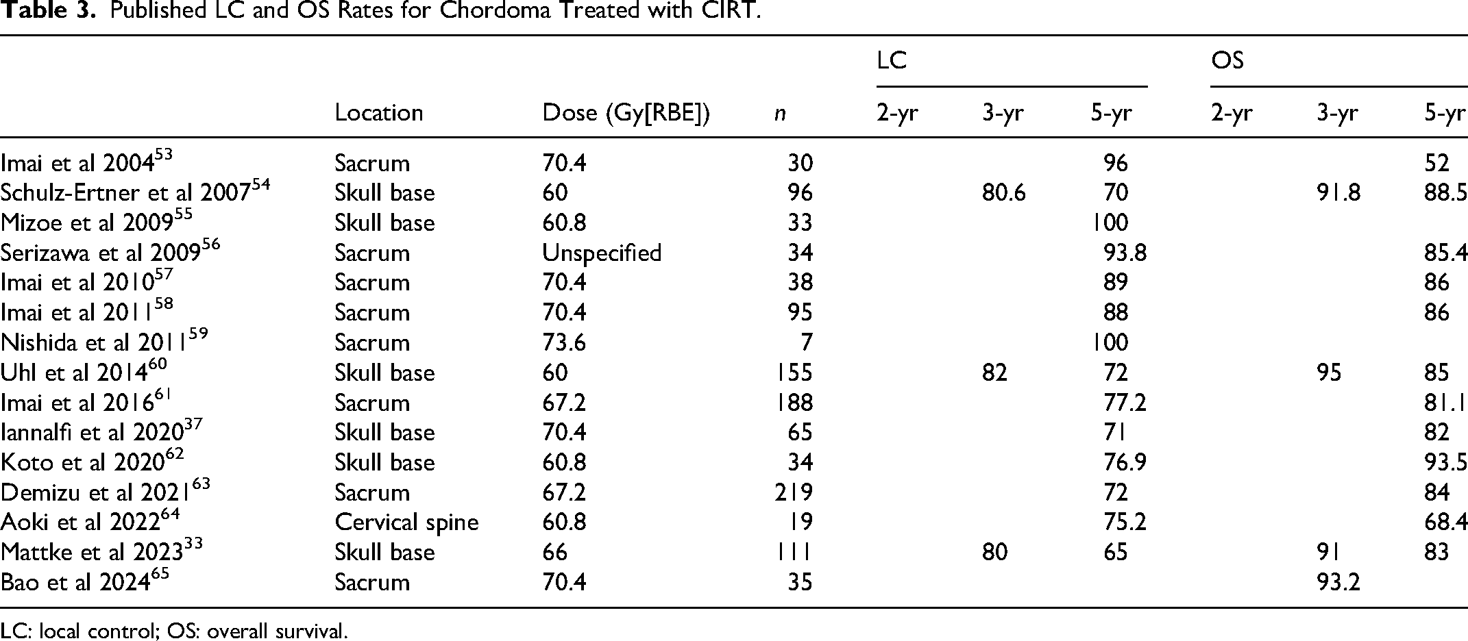 Published LC and OS Rates for Chordoma Treated with CIRT.
